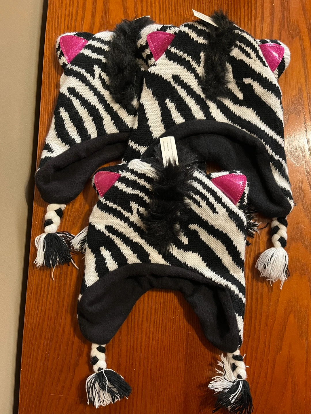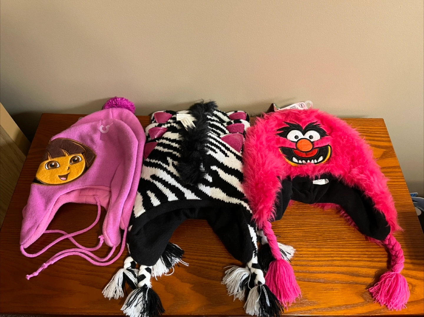 BNWT 6 kids winter hats. Dora and Zebra are 2-4x. Animal is 4-6x. Information is shown in the pictures. Selling all 6 together for $10. Cross posted.