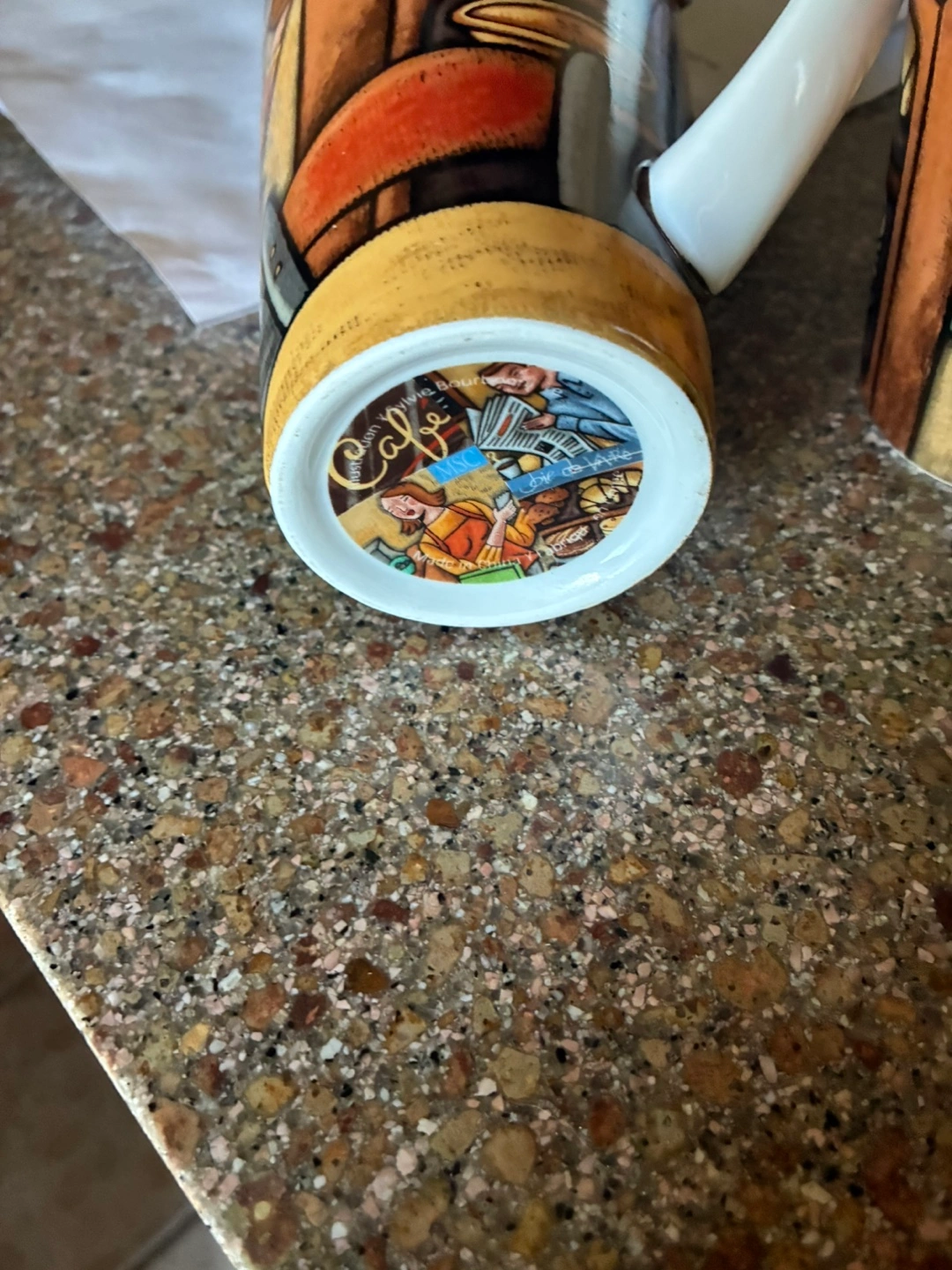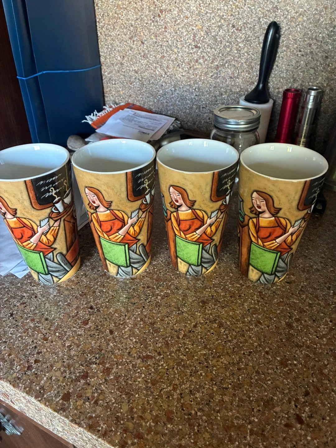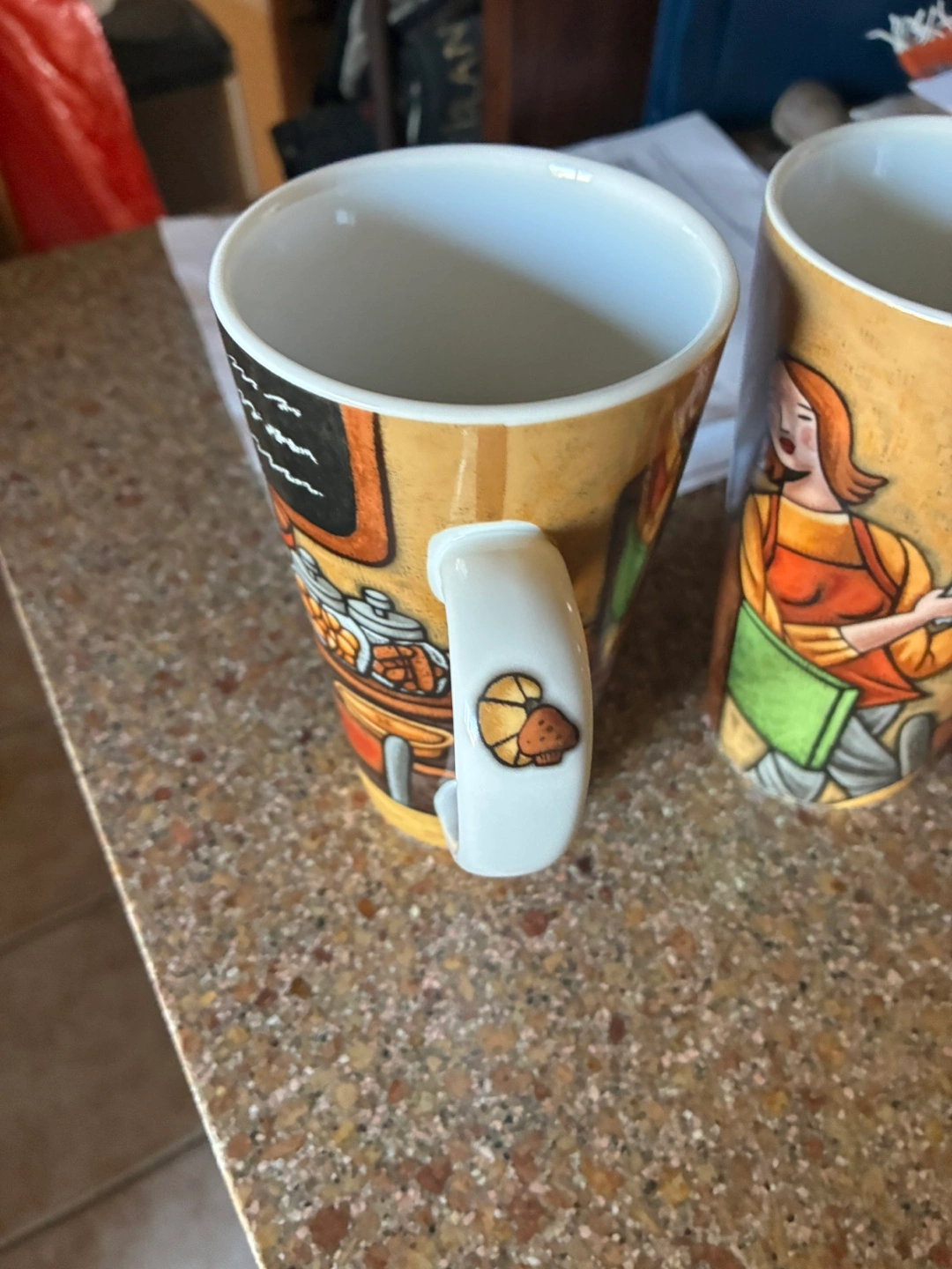 Selling a set of Continental Bagels Cafe Latte mugs. They feature a unique design with images related to a cafe setting. Great for coffee or tea!
