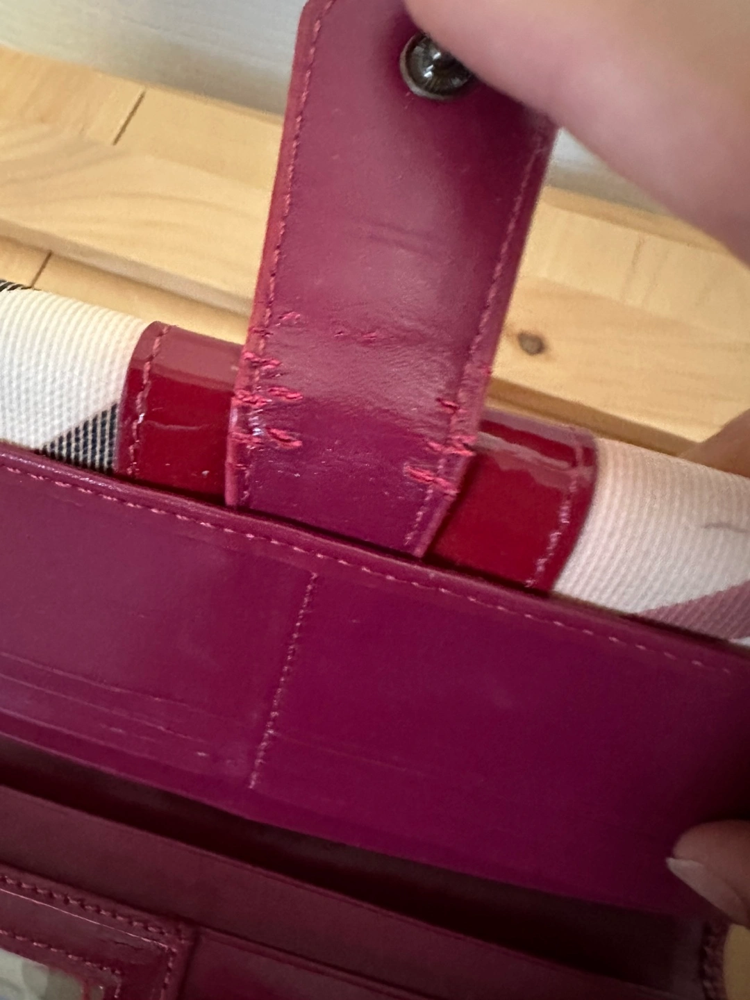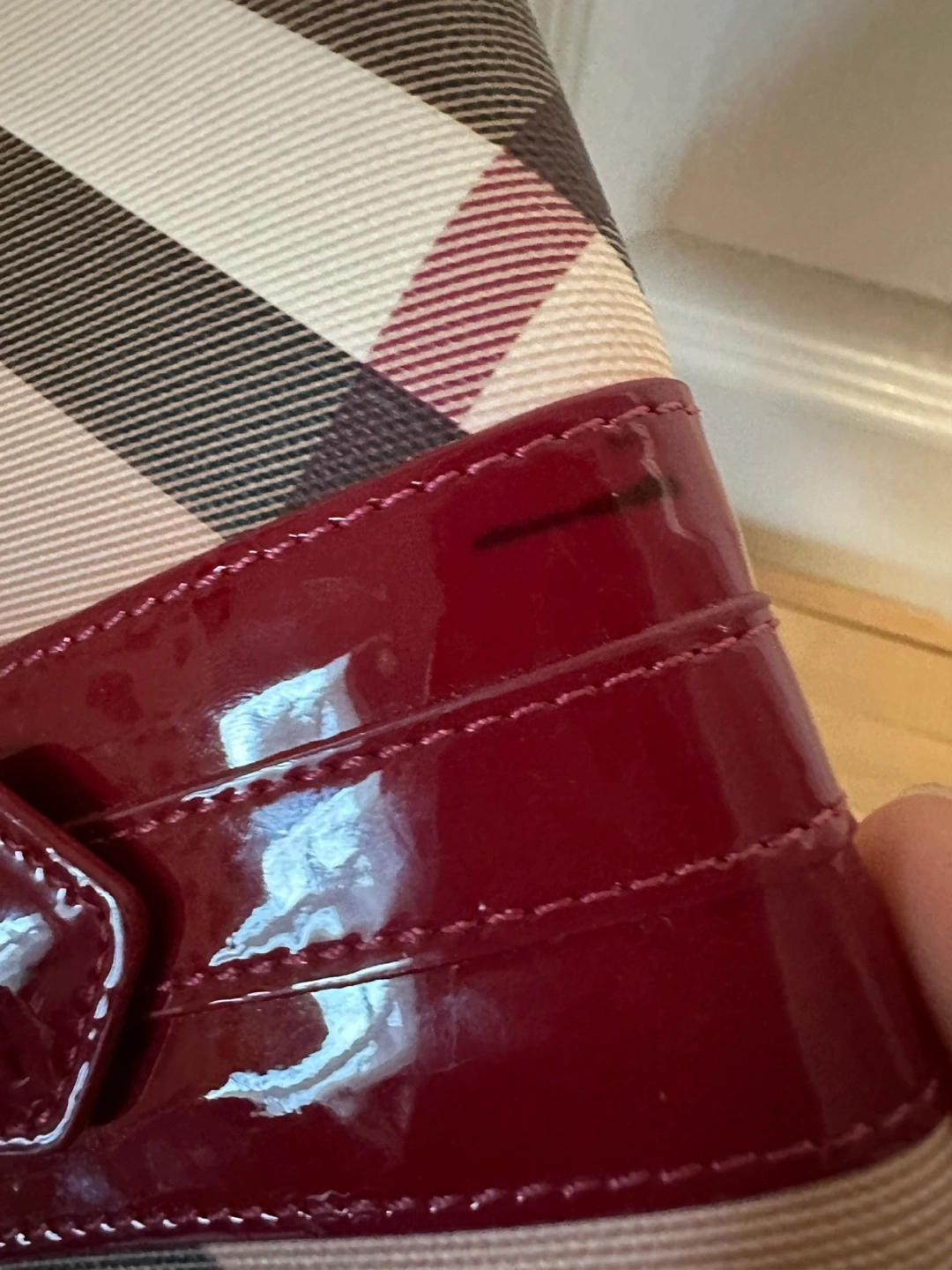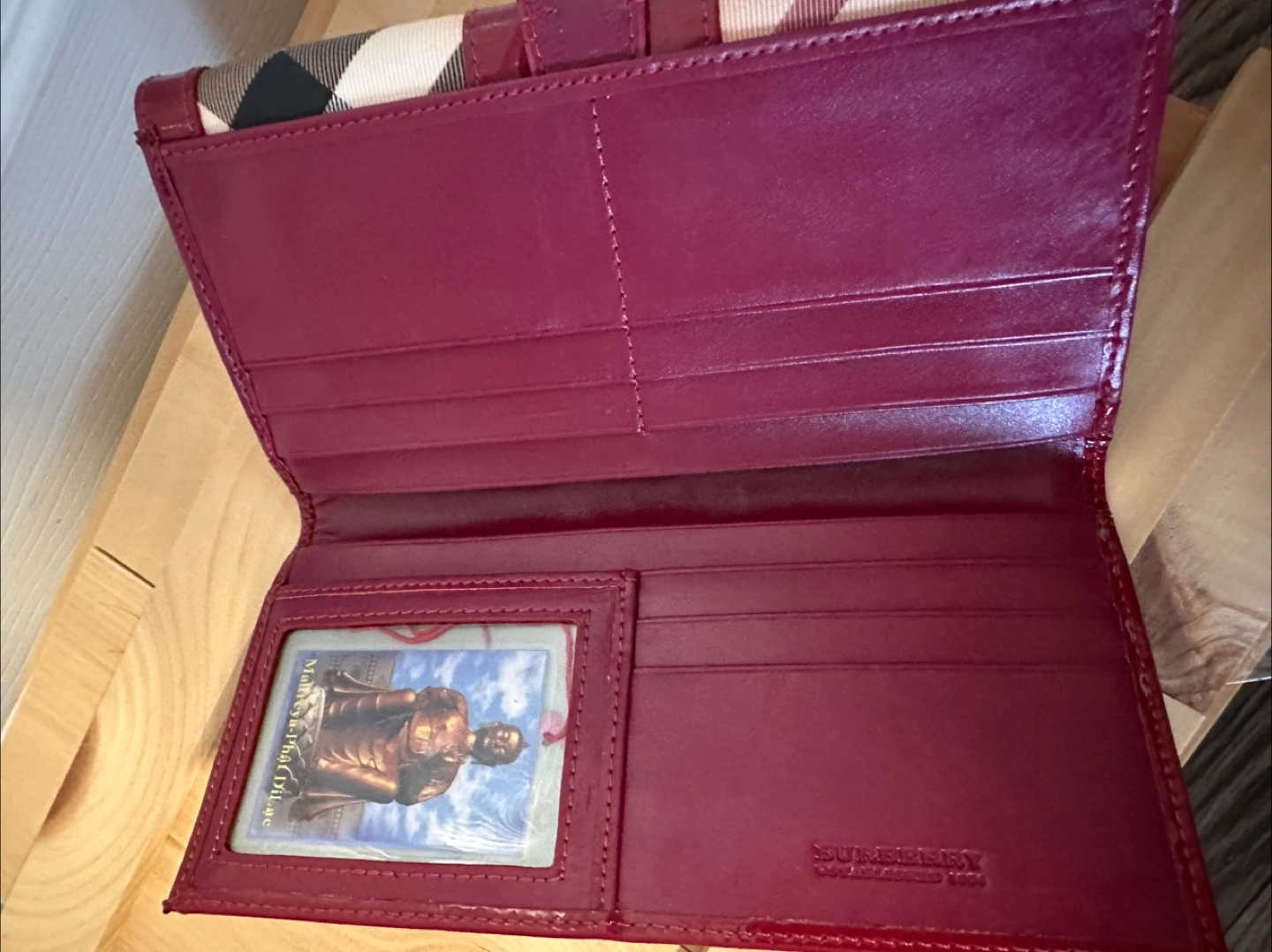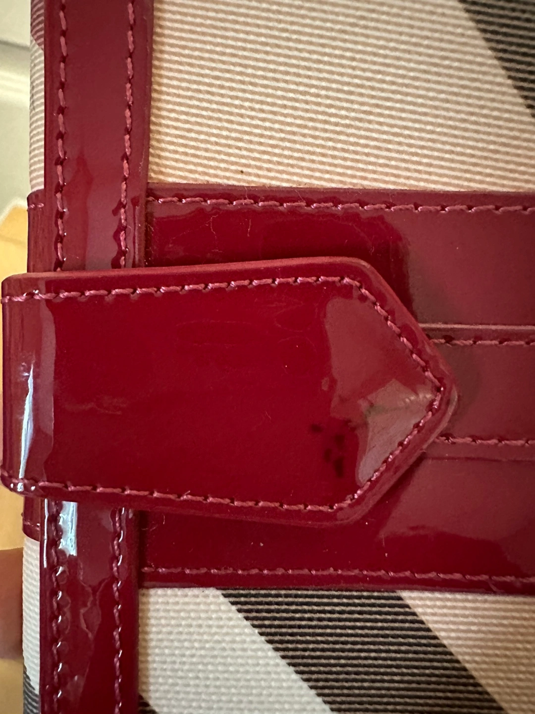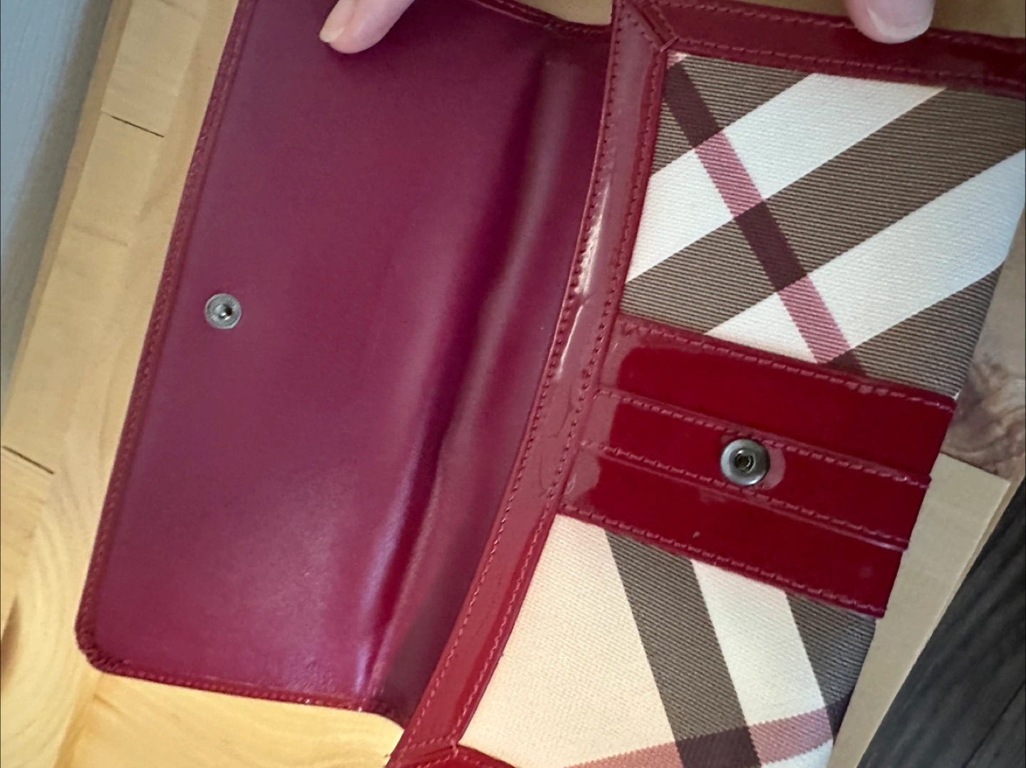 Selling a wallet. It has a red patent leather trim and the classic Burberry plaid pattern. Please see the photos for condition.