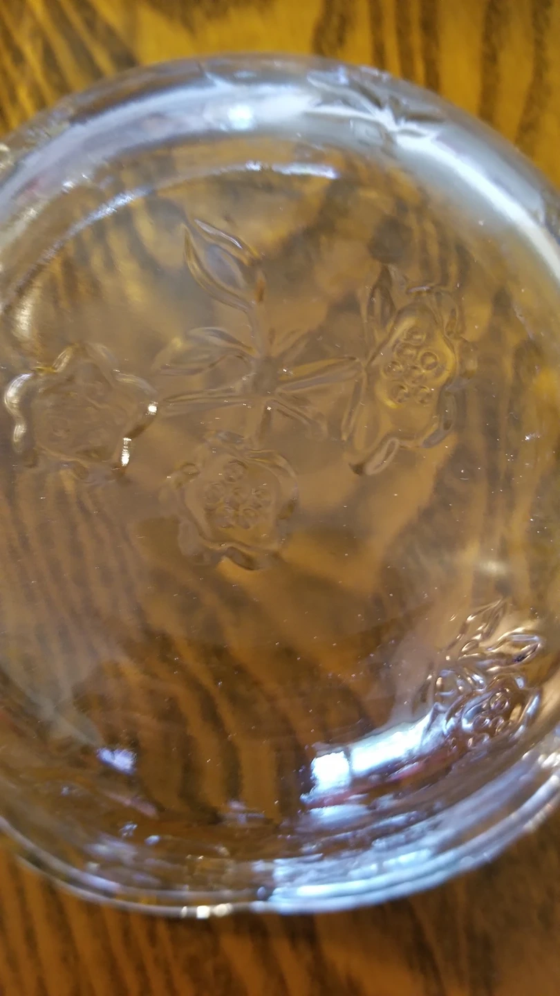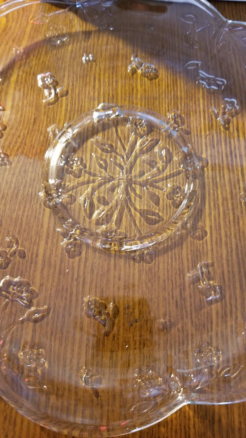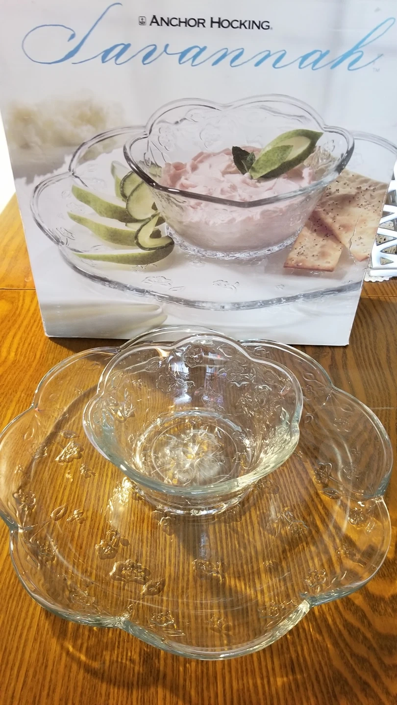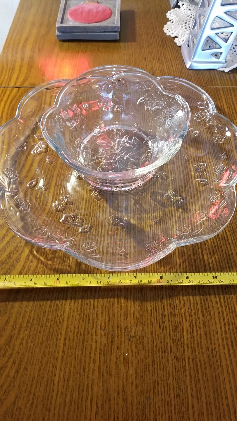 Excellent condition. No chips. Nice floral design. Comes with orignal box. Very pretty. I am just down sizing and cannot take everything sadly.
