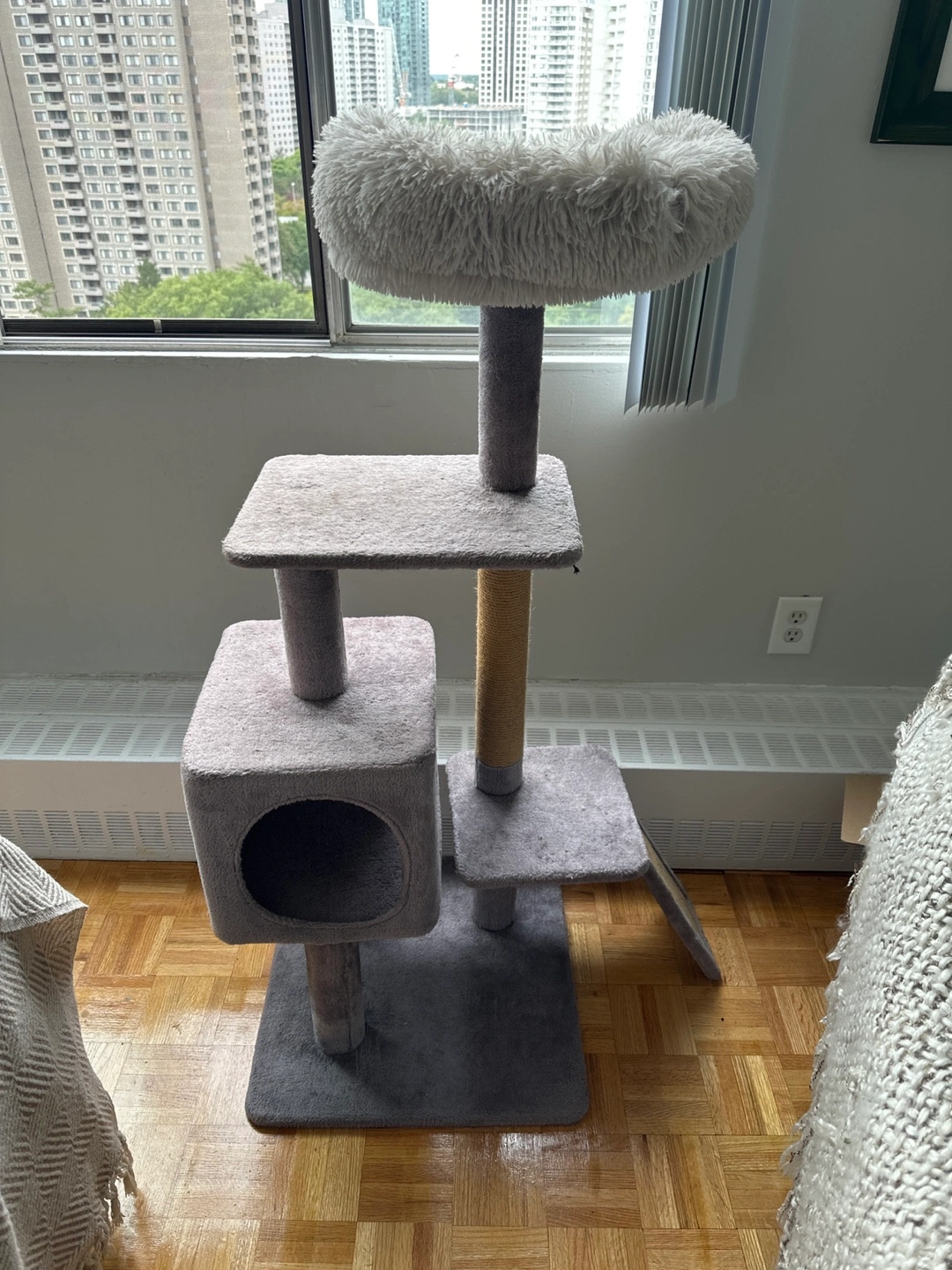 Selling a cat tree in great condition! It features multiple levels for your cat to explore, including a cozy plush top for lounging. The tree also includes a scratching post wrapped in sisal rope to keep your cat's claws healthy and your furniture safe. It's a great way to provide your cat with exercise and entertainment indoors