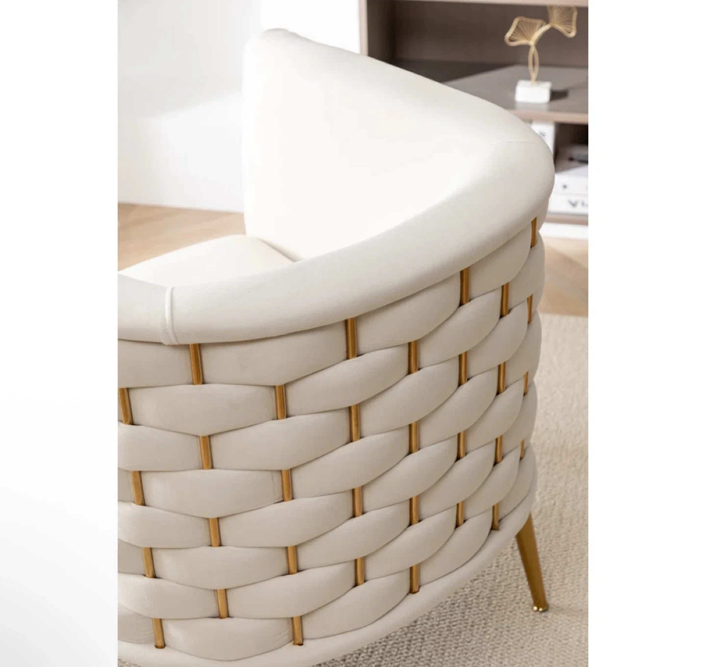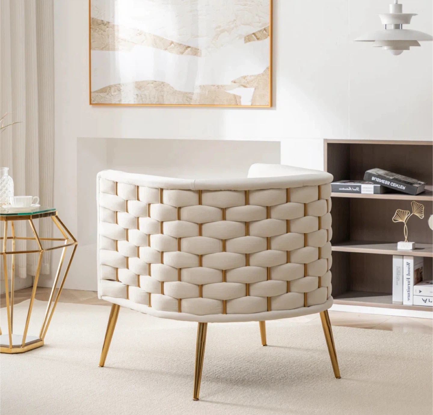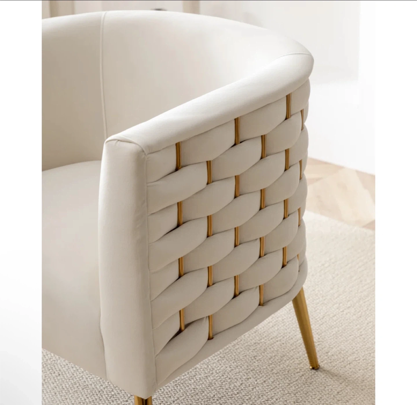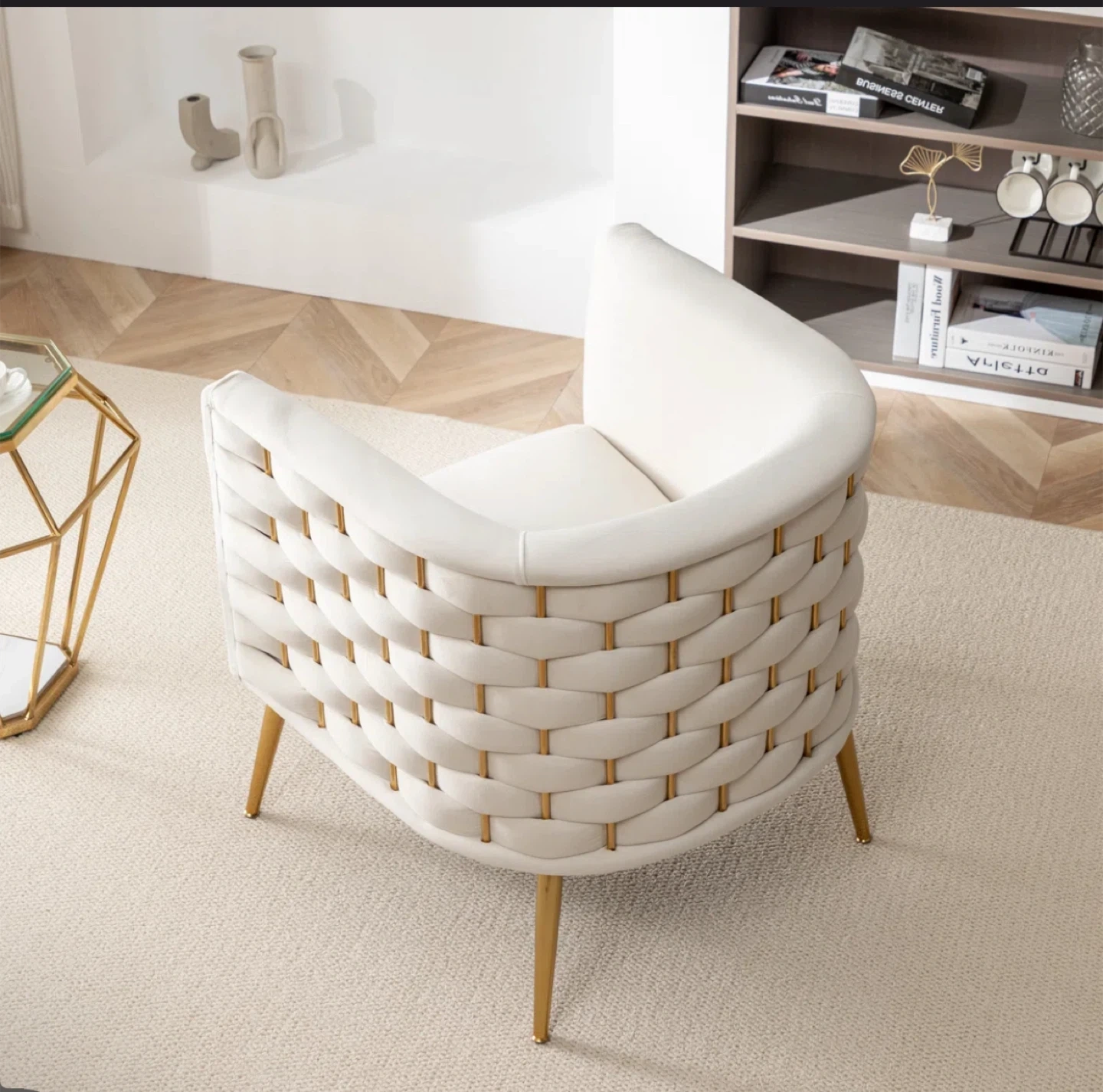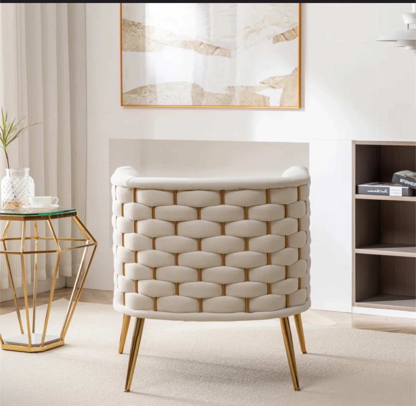 Looking to add a touch of elegance to your space? This cream-coloured accent chair features a unique woven back design and sleek gold legs. It's the perfect addition to any living room or bedroom, offering both style and comfort. A great piece to brighten up your home!