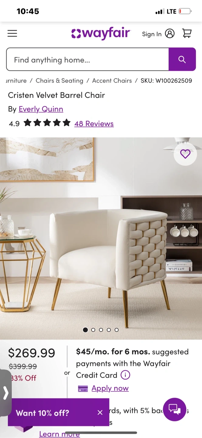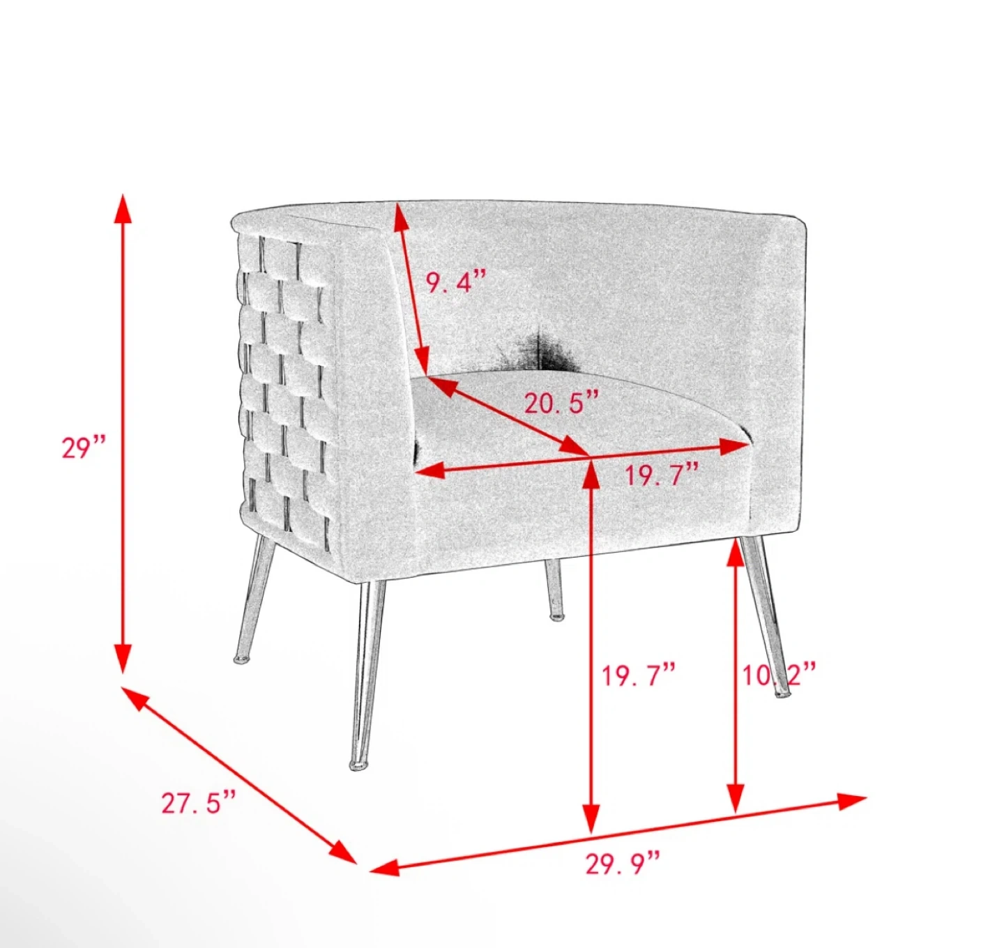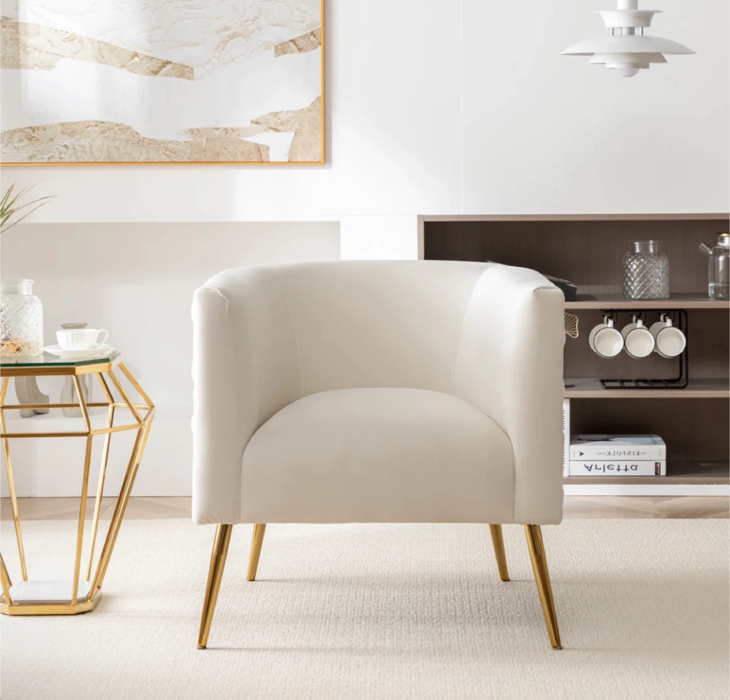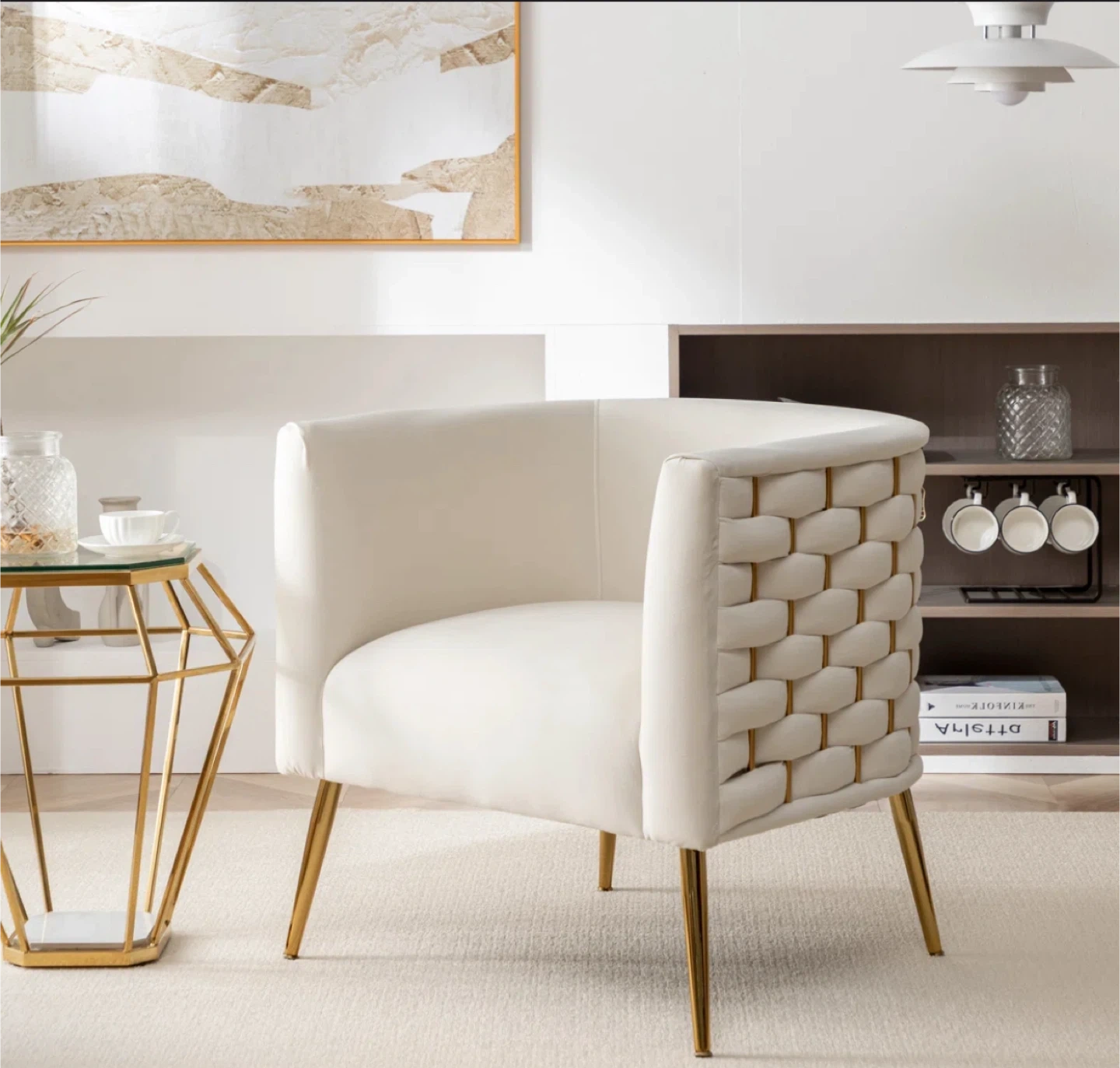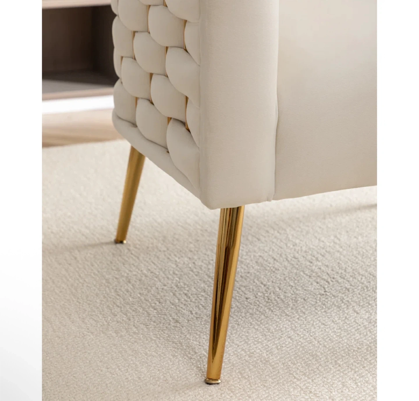 Looking to add a touch of elegance to your space? This cream-coloured accent chair features a unique woven back design and sleek gold legs. It's the perfect addition to any living room or bedroom, offering both style and comfort. A great piece to brighten up your home!