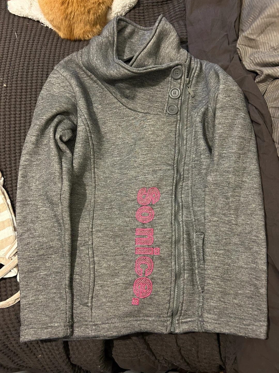 Selling a comfy grey zip-up jacket. It features an asymmetrical zipper and button closure, plus a cozy high collar. Perfect for layering on those chilly days!