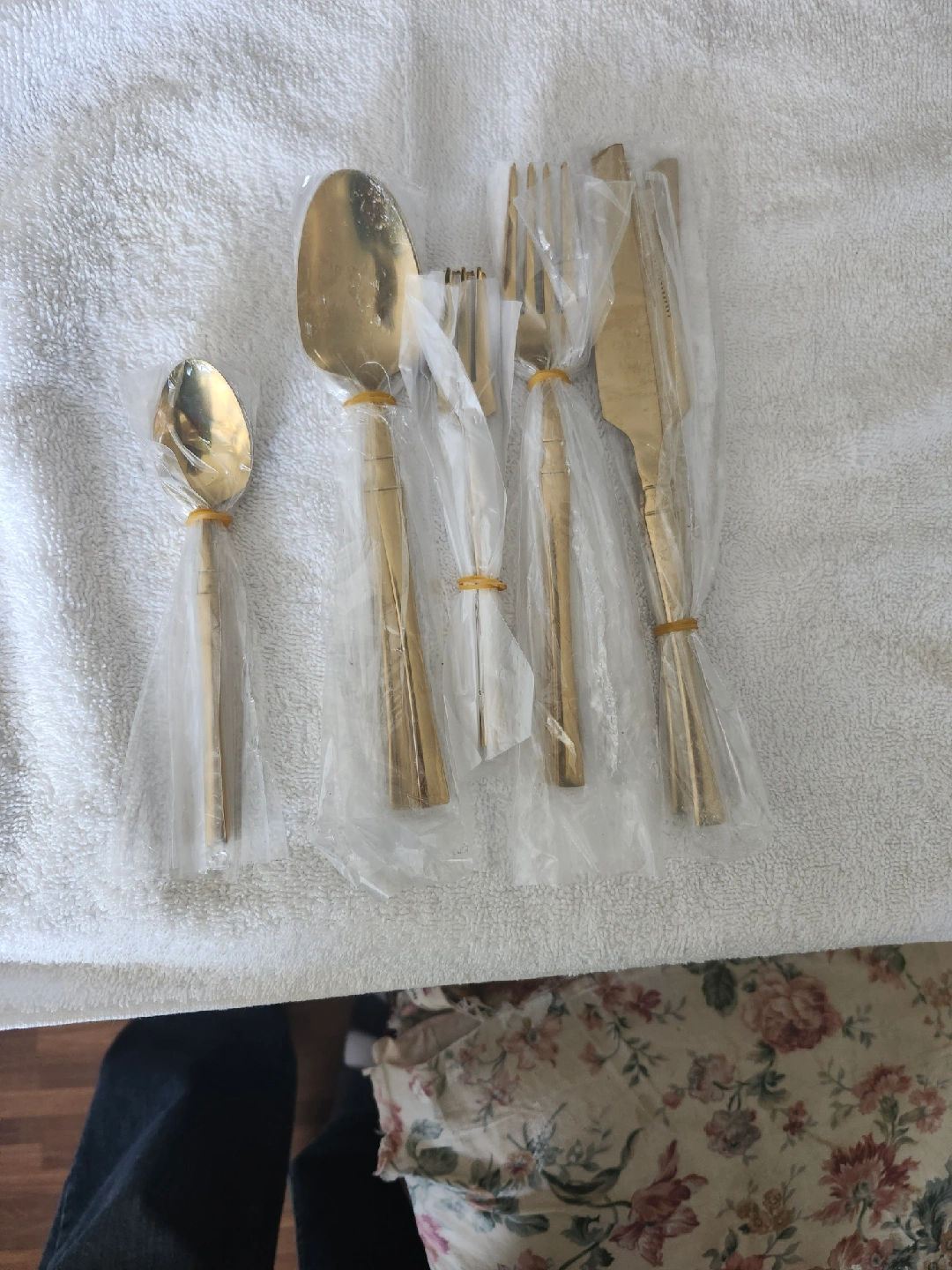 Selling a set of gold-coloured flatware. There are 5 pieces in total, still in their original packaging. Perfect for adding a touch of elegance to your table setting!