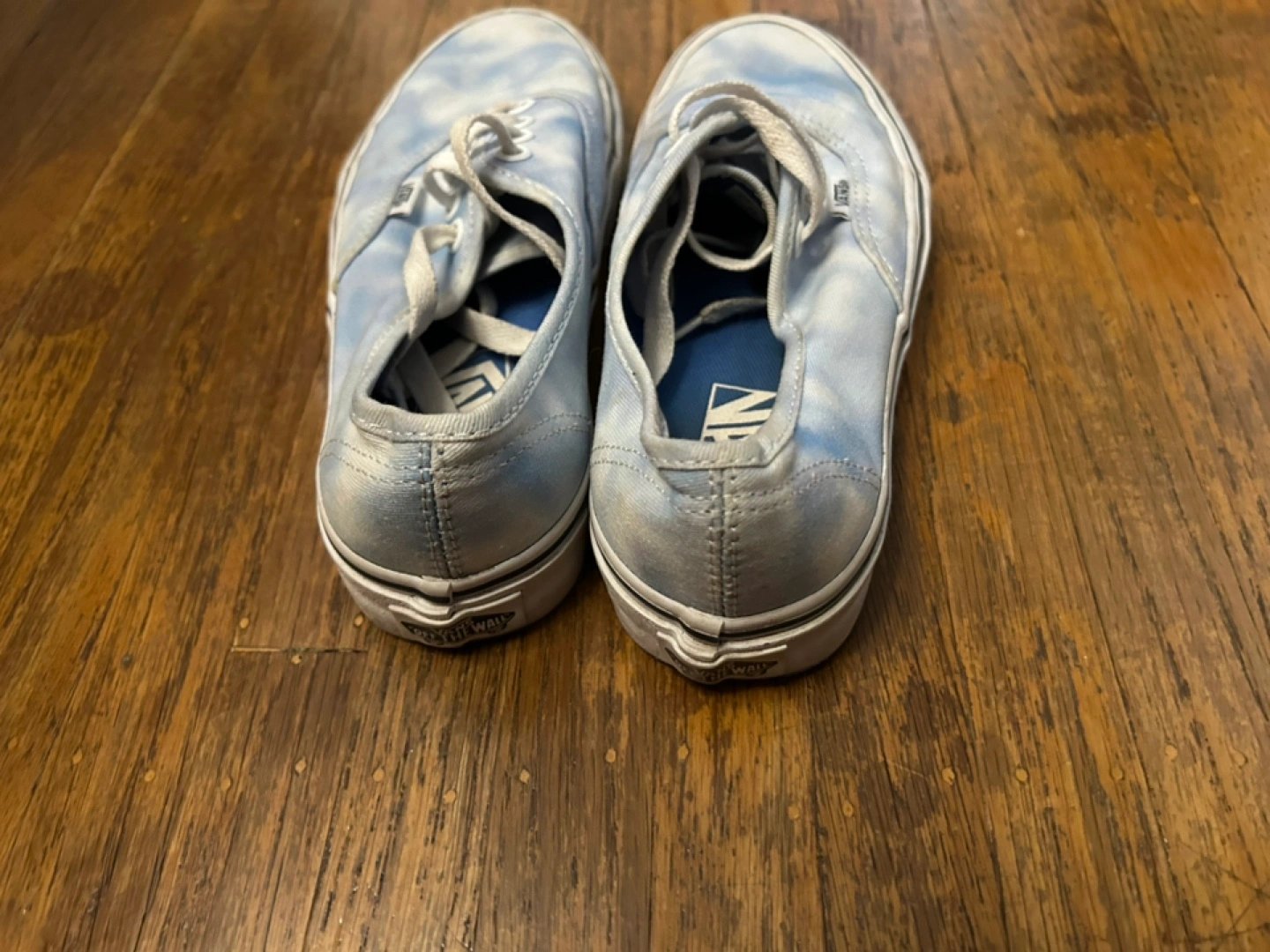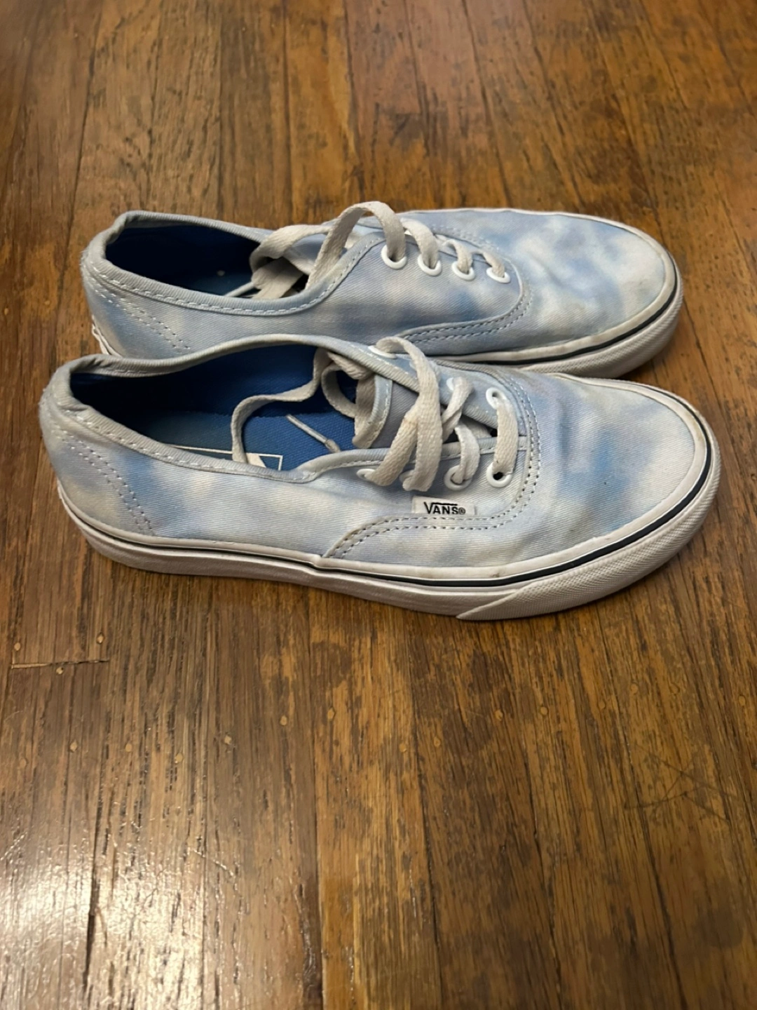 Selling a pair of Vans Authentic sneakers with a cool blue tie-dye pattern! They're in good used condition and ready for a new owner. These are a classic, comfortable choice for everyday wear