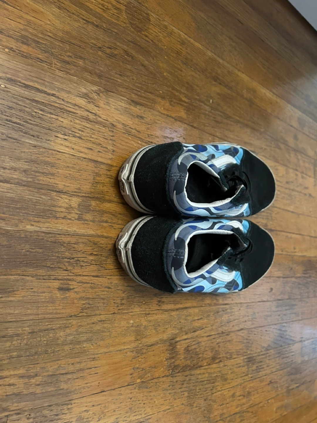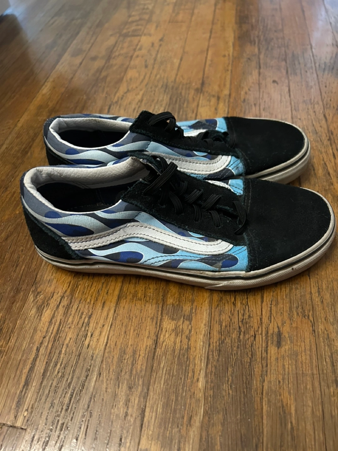 Selling a pair of Vans Old Skool shoes with a cool blue flame design. They're in good used condition and ready for a new home! Kids 3. The main colours are black and blue.
