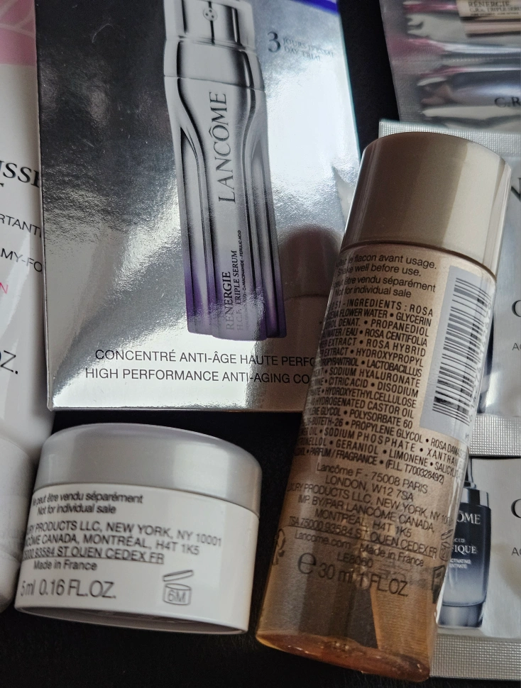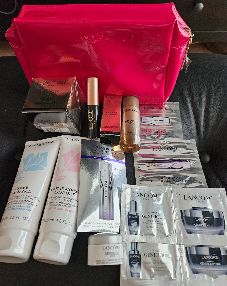 A collection of Lancôme beauty products, including: - Absolue Crème Fondante Soft Cream (15ml) - Absolue The Serum (5ml) - Absolue Rose 80 (30ml) - Rénergie H.C.F. Triple Serum - 4 days trial in total - Rénergie Triple Serum - Advanced Génifique Youth Activating Concentrate - Rénergie dark circle eye cream (5ml) - Crème Radiance (125ml) - Crème-Mousse Confort (125ml) - Idôle Mascara - Red waterproof cosmetic case Pick up only @ McMahon drive near North York Ikea