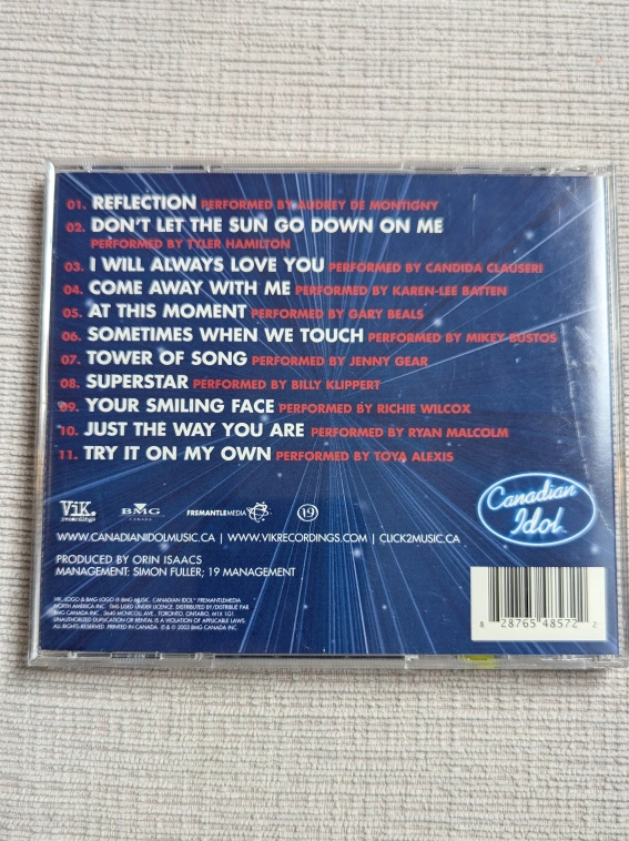 Selling a Canadian Idol: Greatest Moments CD! It features songs like: - Reflection performed by Audrey De Montigny - Don't Let The Sun Go Down On Me performed by Tyler Hamilton - I Will Always Love You performed by Candida Clauseri - Come Away With Me performed by Karen-Lee Batten - At This Moment performed by Gary Beals And many more!