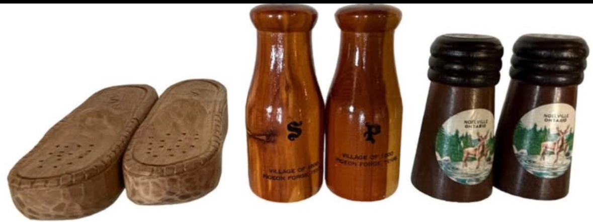 Check out these vintage wooden salt and pepper shakers! One set features a classic 'S' and 'P' for salt and pepper, labelled 'Village of Pigeon Forge'. The other set showcases a charming deer scene and 'Norville, Ontario'. A great addition to any kitchen or collection