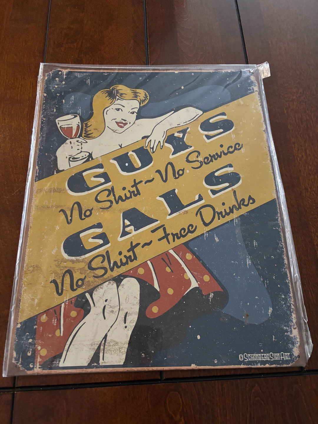 Selling a unique piece of sign art featuring a vintage design with the text "Guys No Shirt~No Service Gals No Shirt~Free Drinks". It's a fun and eye-catching piece to add to any collection