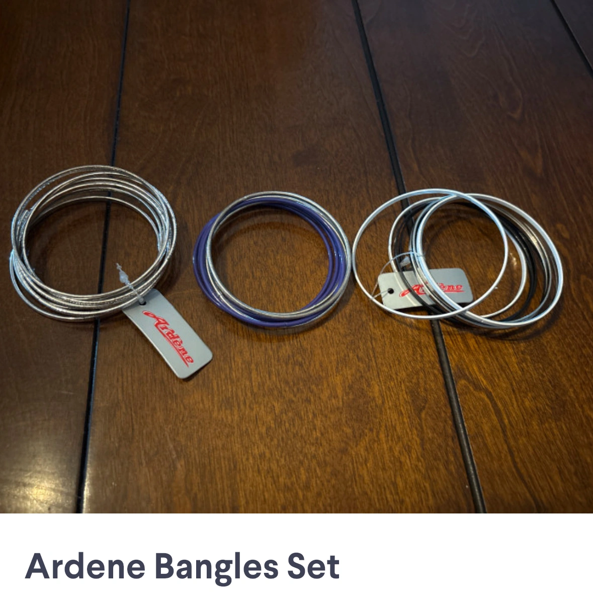 Selling a set of Ardene bangles! There are three sets of bangles in total, with a mix of silver, purple, and black colours. Perfect for adding a little something to your outfit!