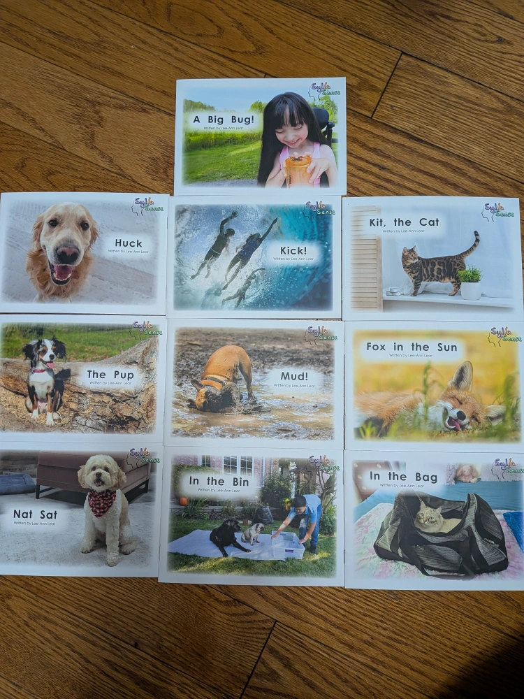 Selling a set of 10 Sylla Sense reading books for young children. Each book features simple words and engaging pictures to help kids learn to read. Titles include Huck, A Big Bug!, Kit, the Cat, Kick!, The Pup, Mud!, Fox in the Sun, In the Bag, In the Bin, and Nat Sat