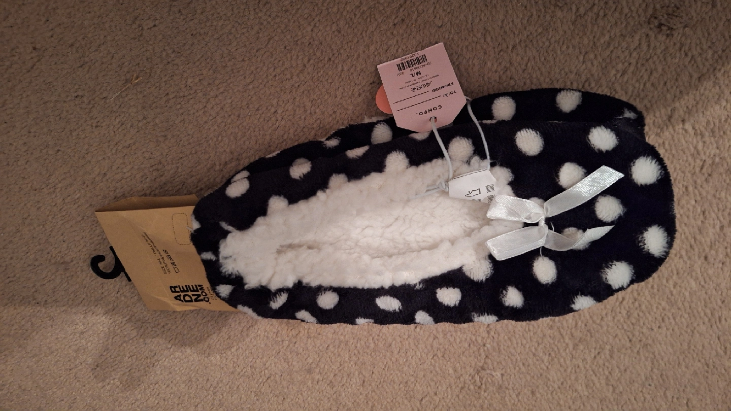 Cozy Ardene slippers in M/L size! These comfy slippers feature a cute polka dot pattern and a soft, plush interior. Perfect for keeping your feet warm and stylish around the house