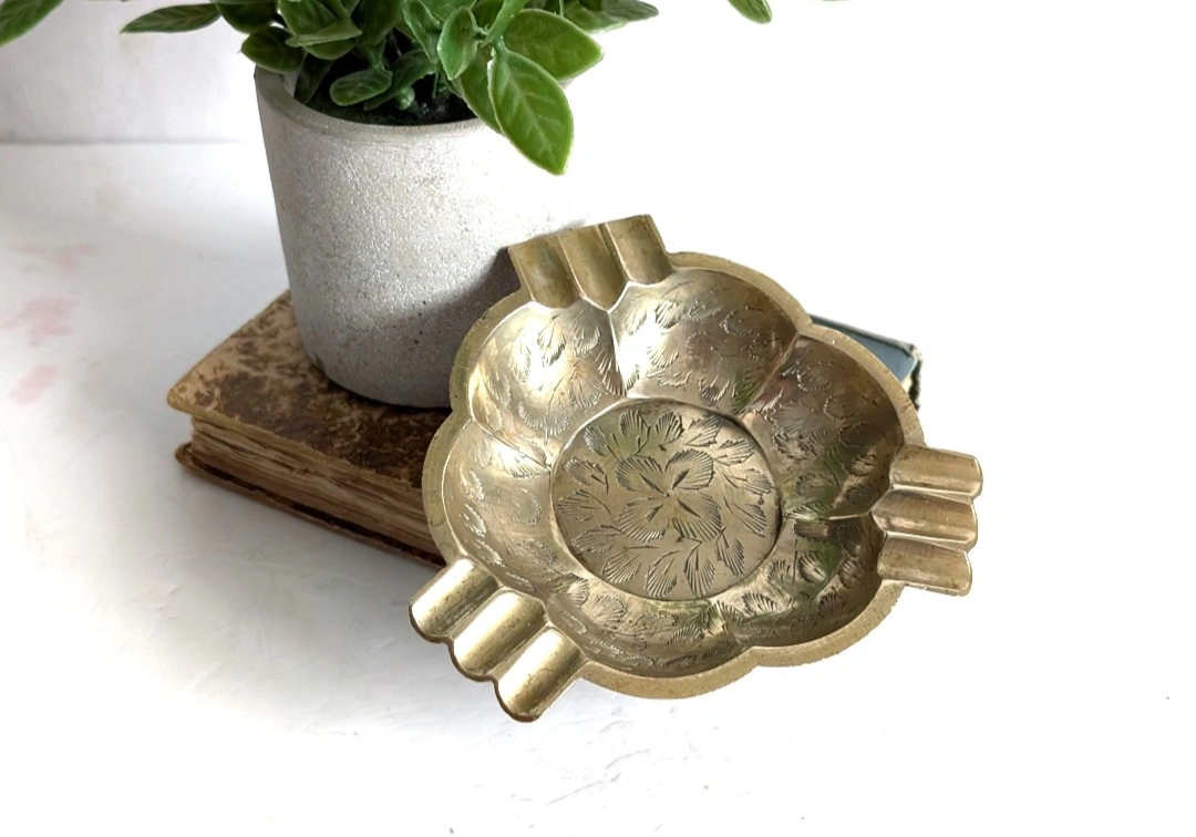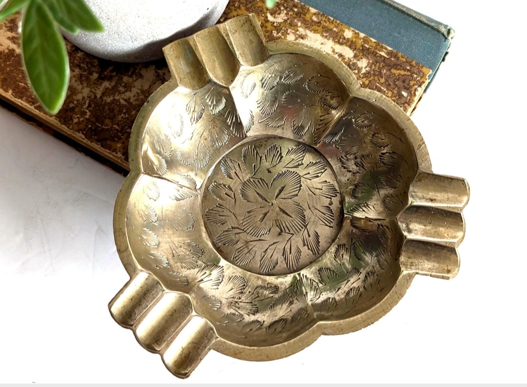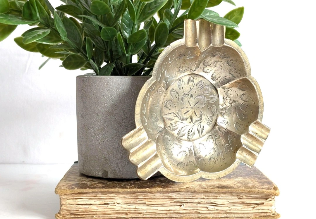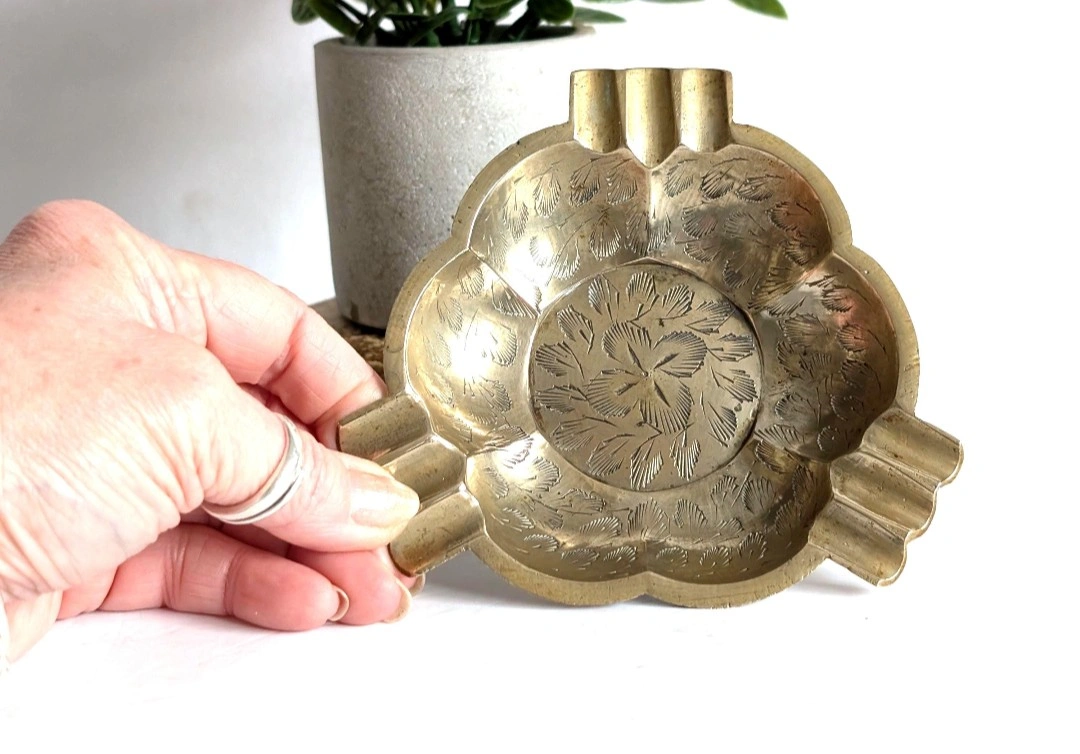 Cute etched brass ashtray. A perfect repurpose project. So many alternatives ~ change dish, ring dish, succulents holder. A little imagination goes a long way. Measures approximately 4 inches in diameter. Good vintage condition, consistent with age. Fabulous retro bohemian vibe. ๐ PICK UP TOWNLINE HWY 2 AREA ๐ CASH is preferred please โบ๏ธ
