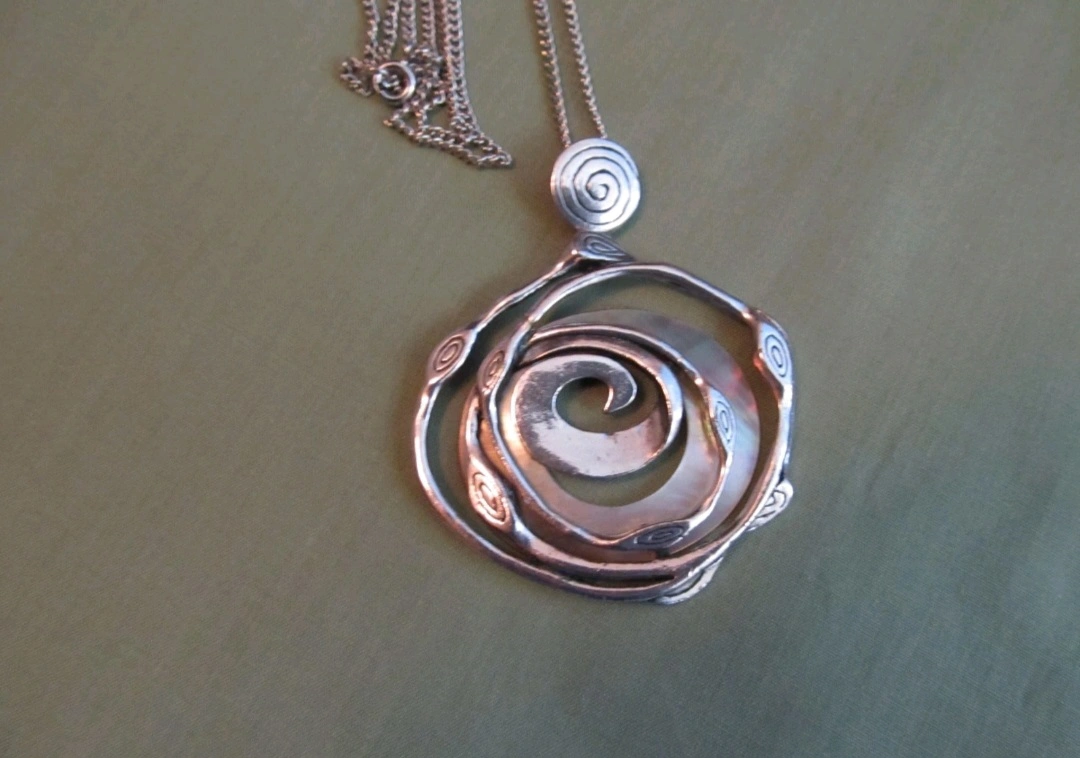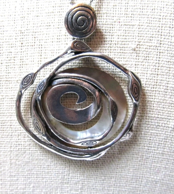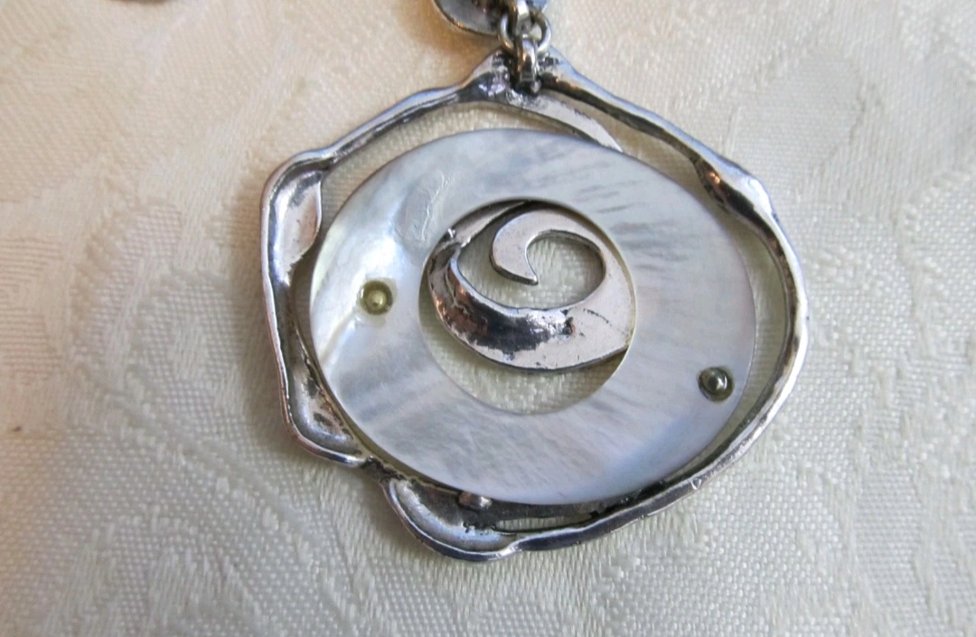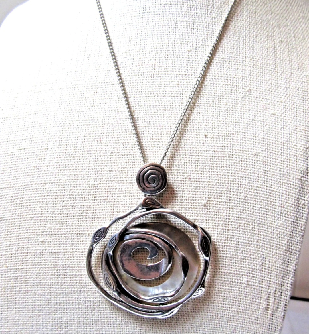 Check out this vintage silver-tone necklace! It features a unique swirl pendant design. The pendant has a mother-of-pearl like background, with silver swirls. Silvertone 28 inch chain lovley Vintage necklace