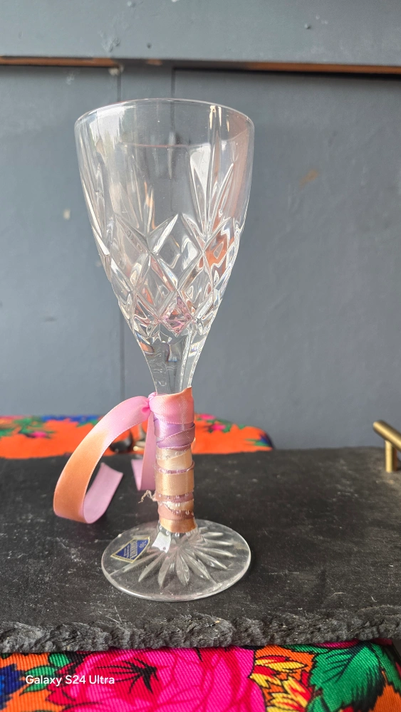 Selling a beautiful crystal wine glass. It has a delicate, diamond-cut pattern and is in great condition. Perfect for adding a touch of elegance to your table!