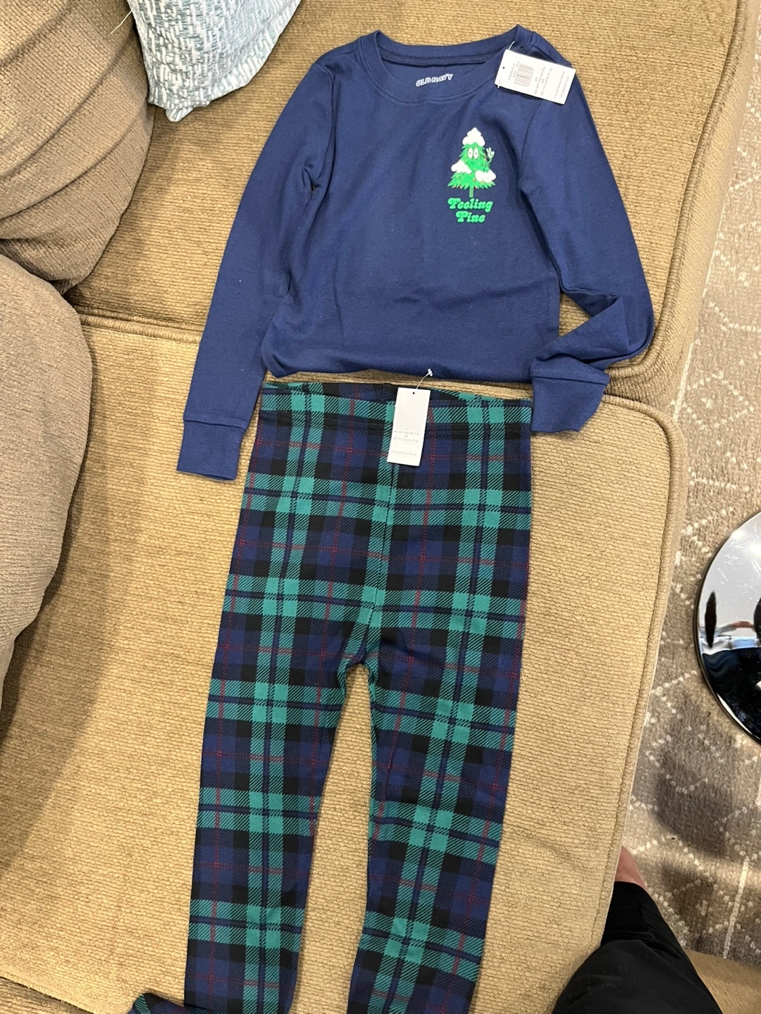 This is a brand new with tags Old Navy pajama set in size 5T. The top is a navy blue with a cute 'Feeling Pine' Christmas tree design. The bottoms are a green and blue plaid. Perfect for the holidays!