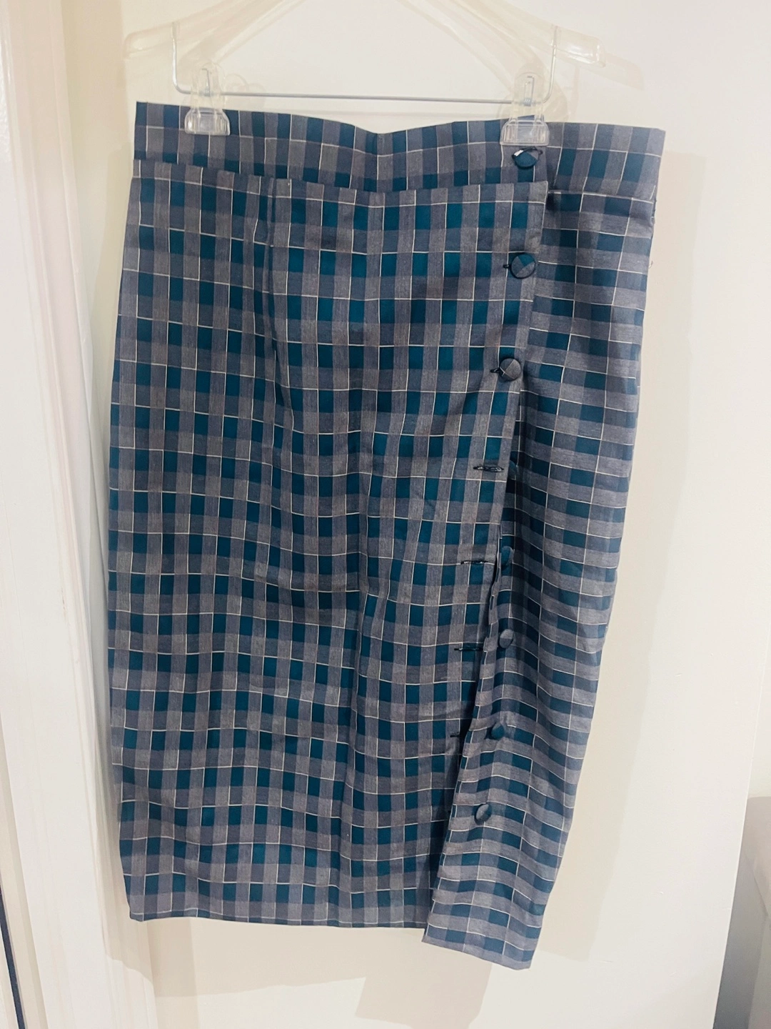 Selling a stylish checkered pencil skirt! The skirt features a unique button detail on the side. It's perfect for adding a touch of sophistication to your wardrobe. Great for both casual and professional settings
