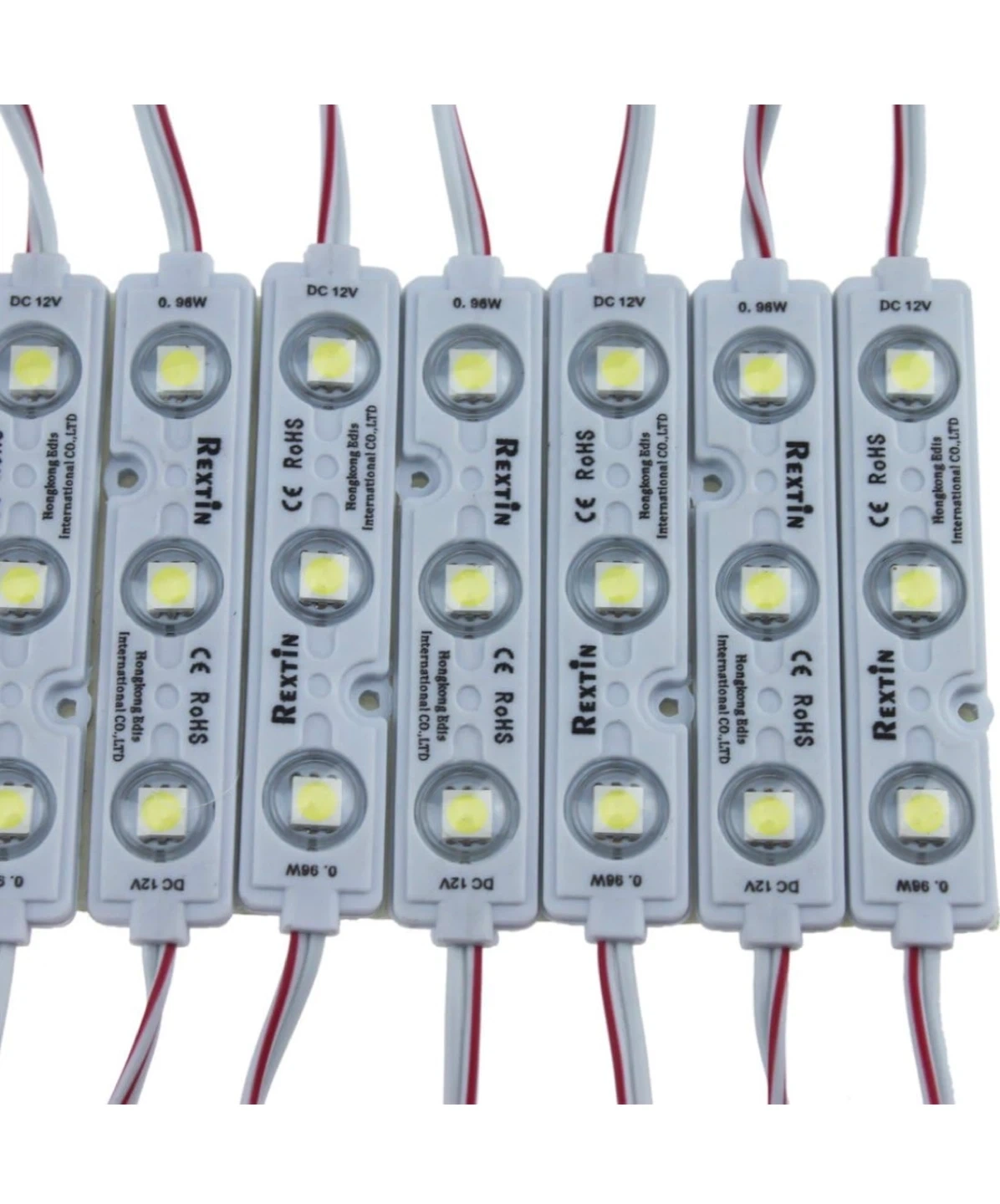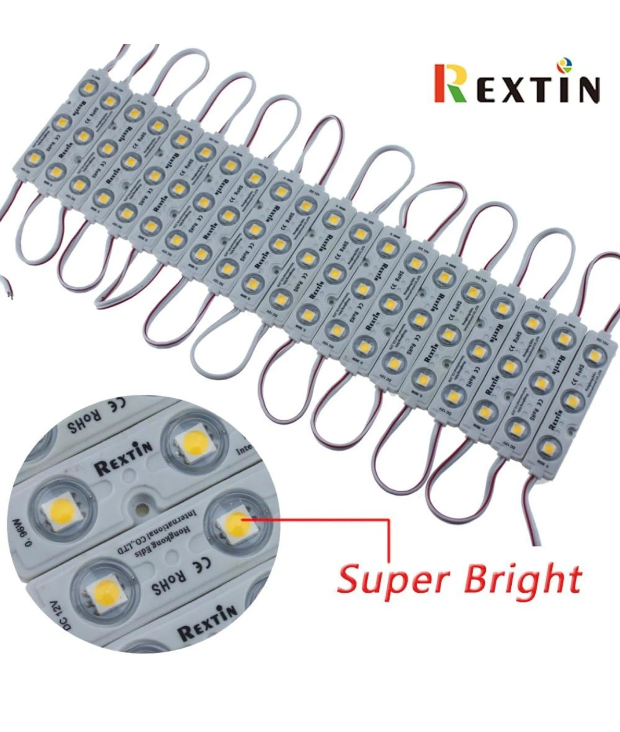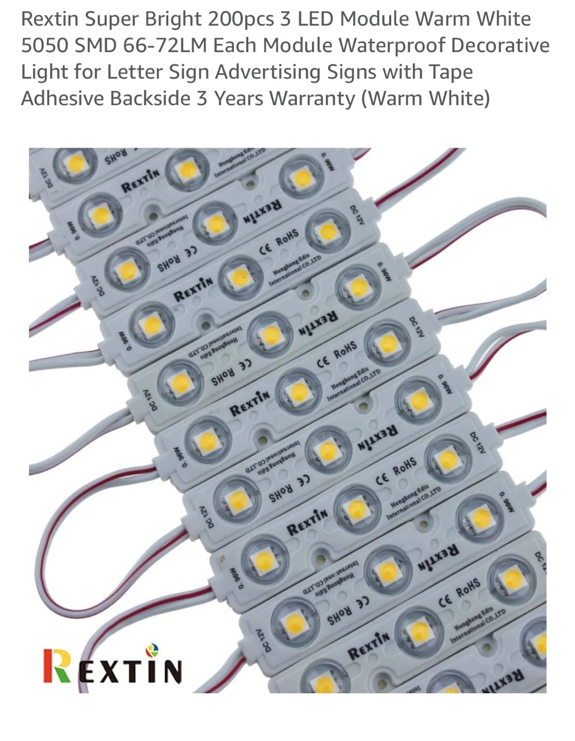 Selling Rextin Super Bright 200pcs 3 LED Module Warm White 5050 SMD lights. These are waterproof decorative lights perfect for letter sign advertising signs with tape adhesive backing. They come with a 3-year warranty and provide a warm white light
