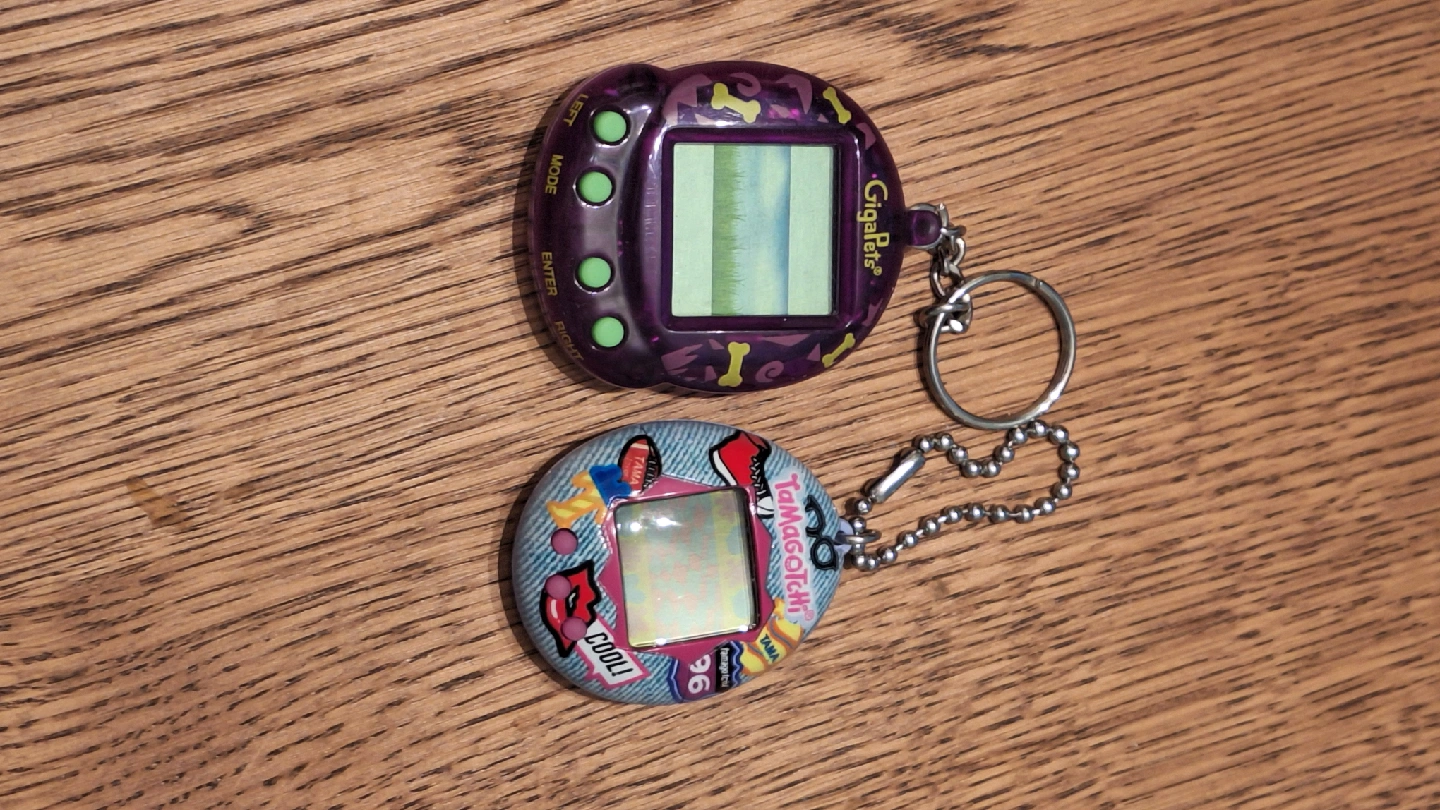 Selling two virtual pets: a Giga Pets and a Tamagotchi! Both are in good condition and ready for a new owner to take care of them. They each have a keychain attached.