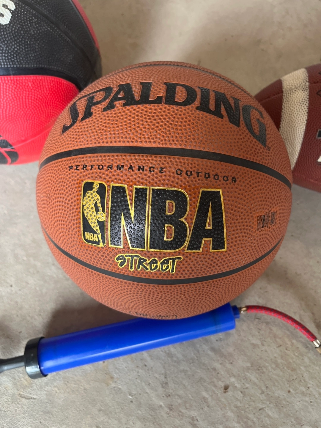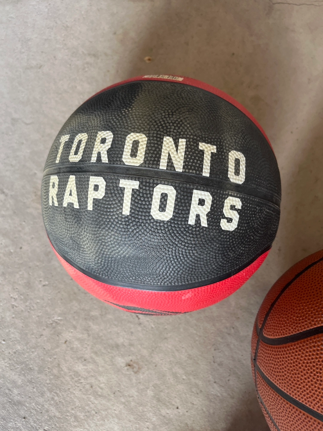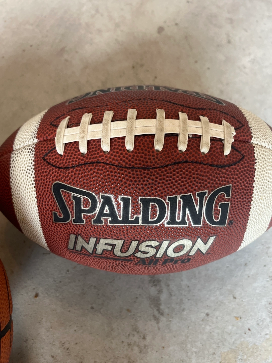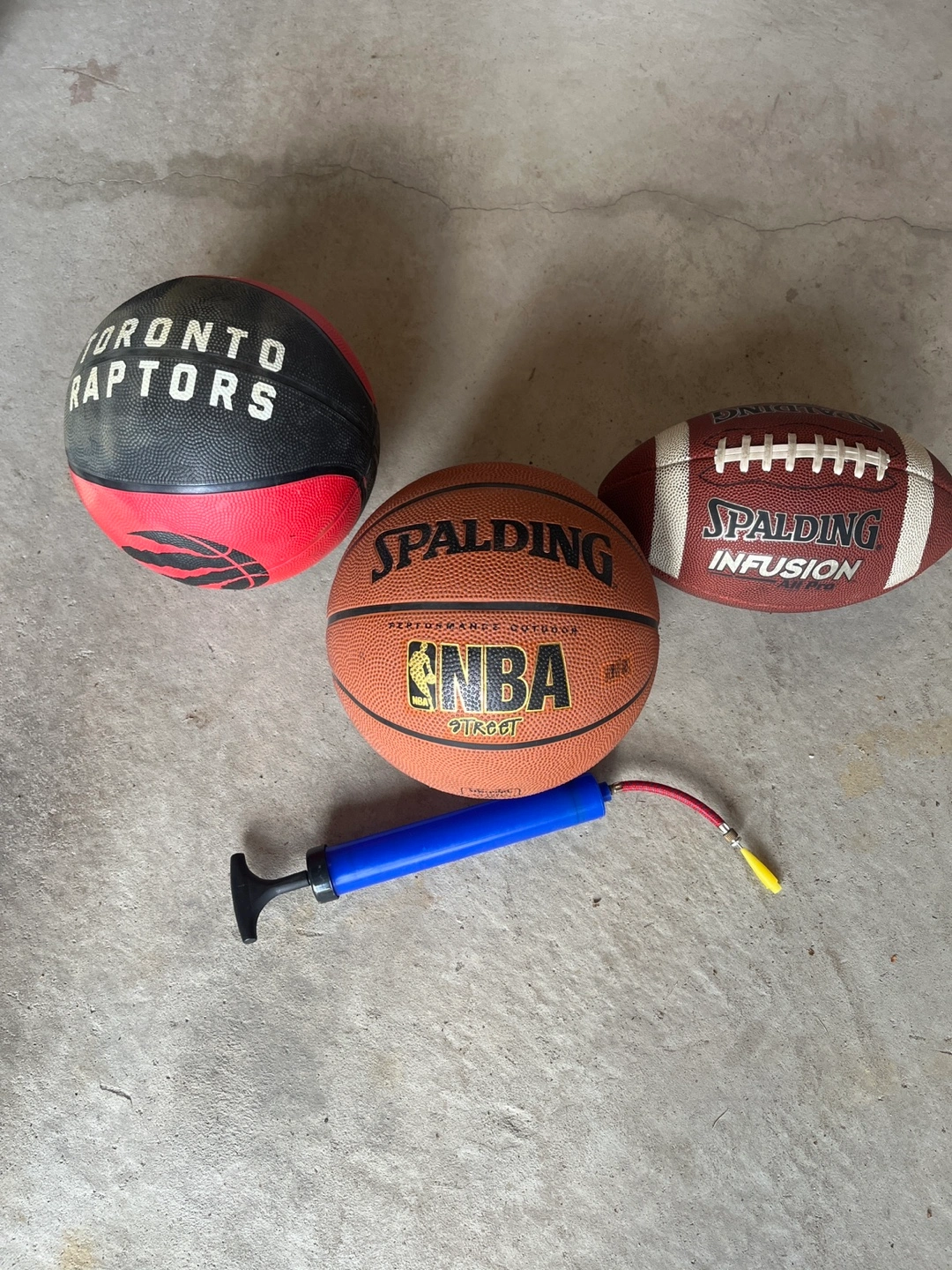 Selling a Spalding Infusion Pro football and two basketballs: one NBA Street basketball and one Toronto Raptors basketball. Great for some outdoor fun! Also, free ball pump!
