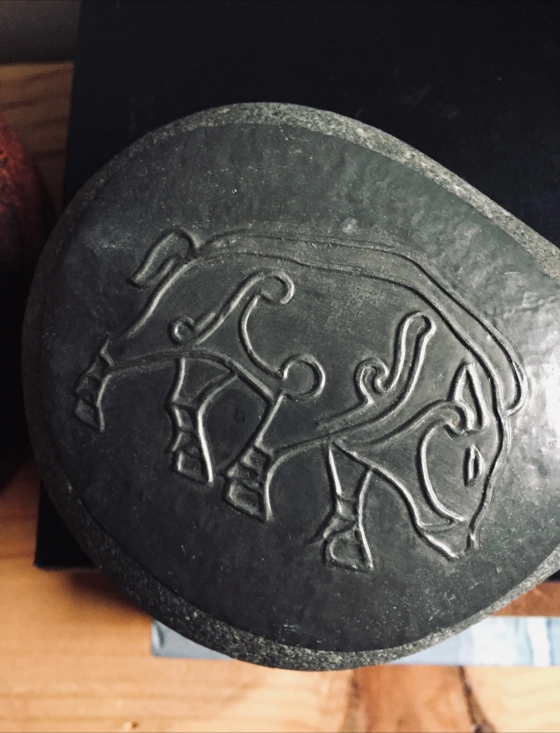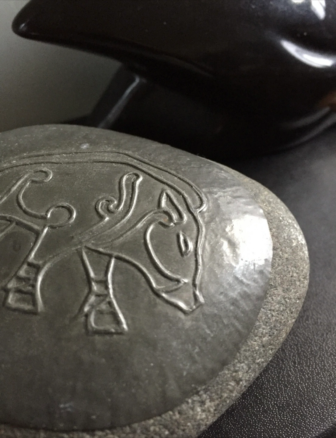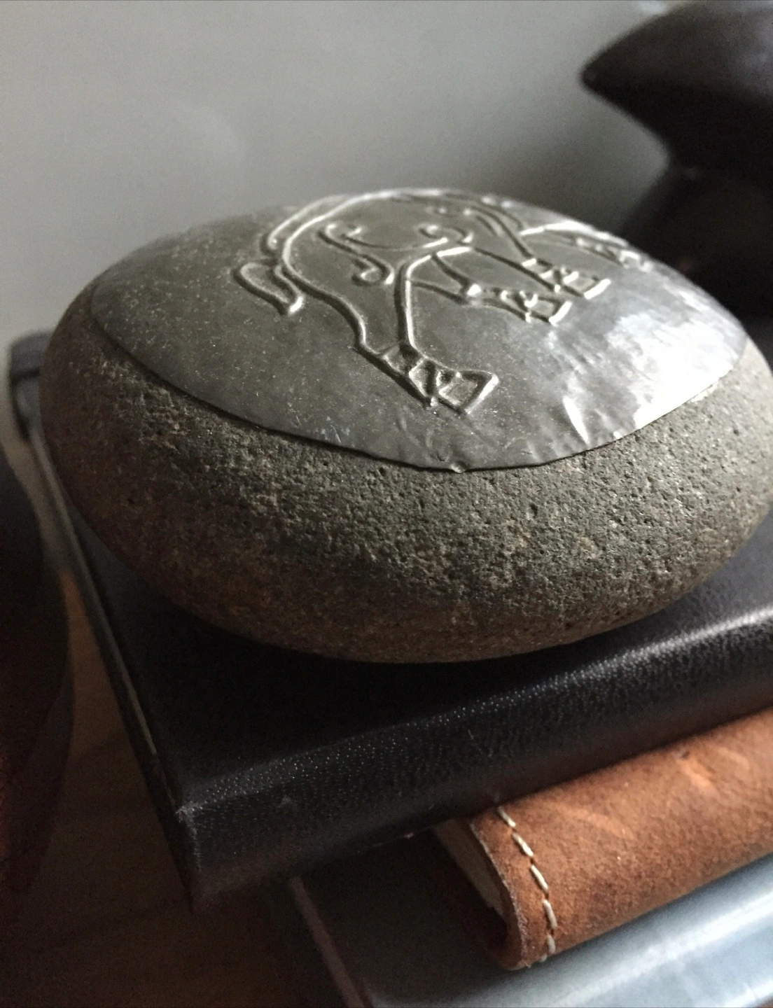 ➡️Cash & Pickup ONLY First come first serve A one-of-a-kind gray stone paperweight, adorned with a wild boar metal inlay. Its sleek, minimalist surface and handcrafted detail give it a calming, grounded presence. A striking blend of vintage craftsmanship and contemporary design, perfect for collectors. MEASUREMENTS ----------------------- LENGTH - 3.5 Inches WIDTH - 4.25 Inches