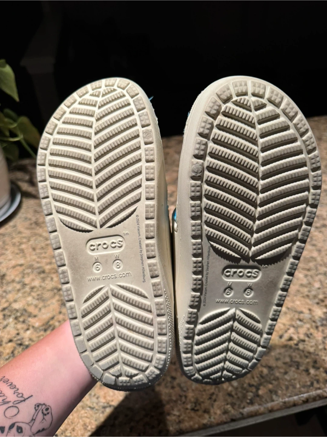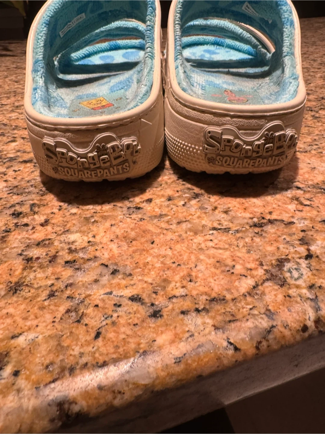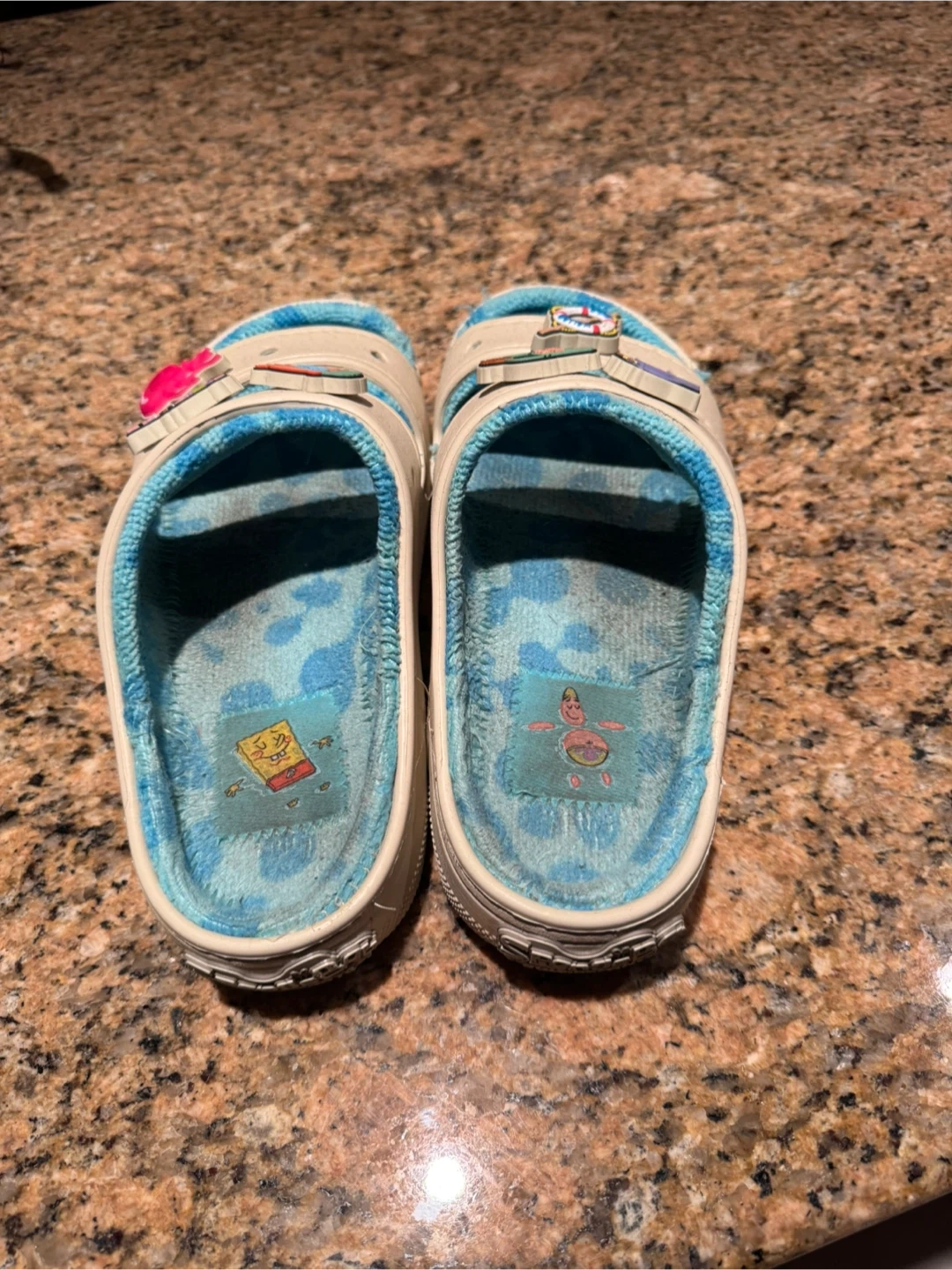These are a pair of Crocs sandals featuring SpongeBob SquarePants! They are a size 6 and have some fun charms on the straps. They would be great for a little one who loves SpongeBob! They glow in the dark.