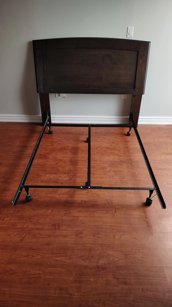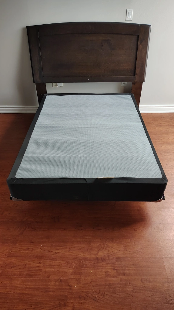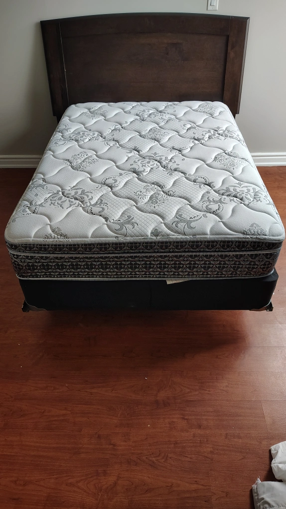 Bed set for sale. What's included: Head board Metal frame Box frame And mattress The bed was used mostly for staging and in pristine condition. We are smoke-free and pet-free house. The size of the mattress:Full. See picture for reference