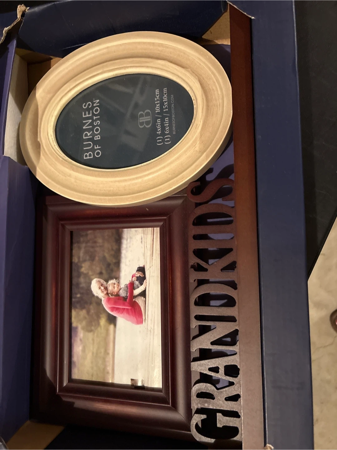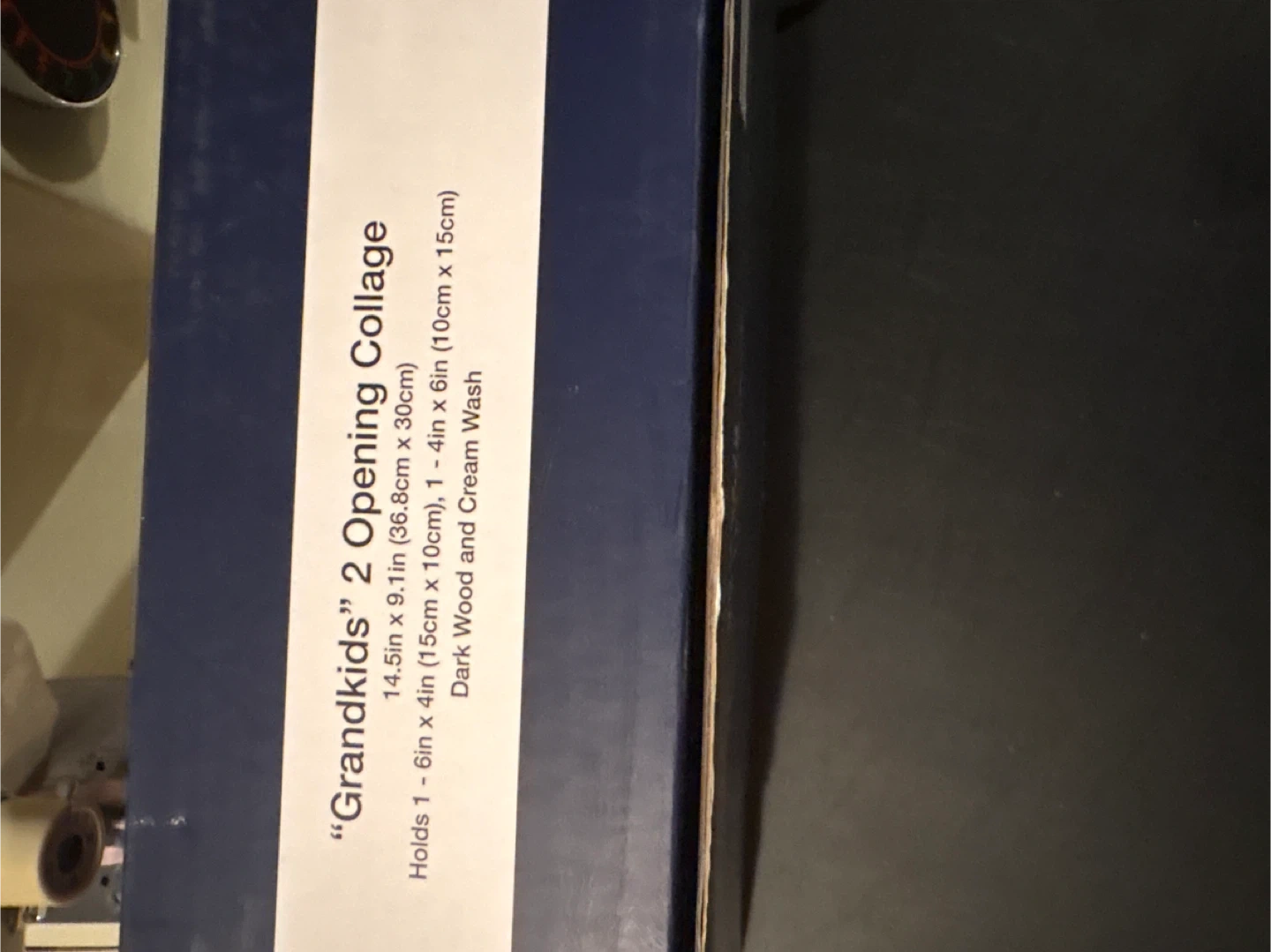 Selling a "Grandkids" Collage frame with two windows/openings. It holds 1 - 6in x 4in (15cm x 10cm) and 1 - 4in x 6in (10cm x 15cm) photos. The frame size is 14.5in x 9.1in (36.8cm x 30cm). It's a dark wood and cream wash finish. Comes in its original box… pick up on Chandos Drive in Chicopee area of South Kitchener N2A4H8