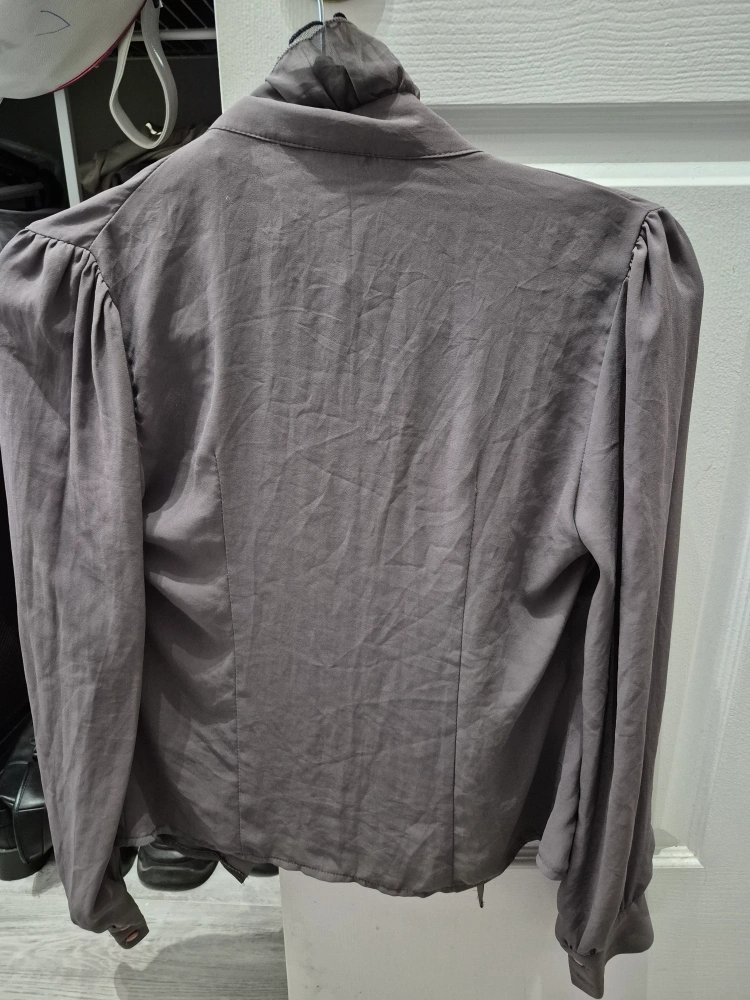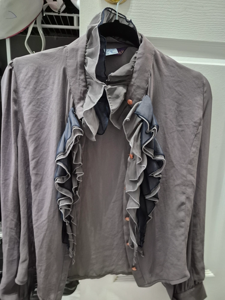 Here's a stylish ruffled blouse in a versatile grey colour! It's a size medium and features unique ruffled detailing. Perfect for adding a touch of elegance to any outfit