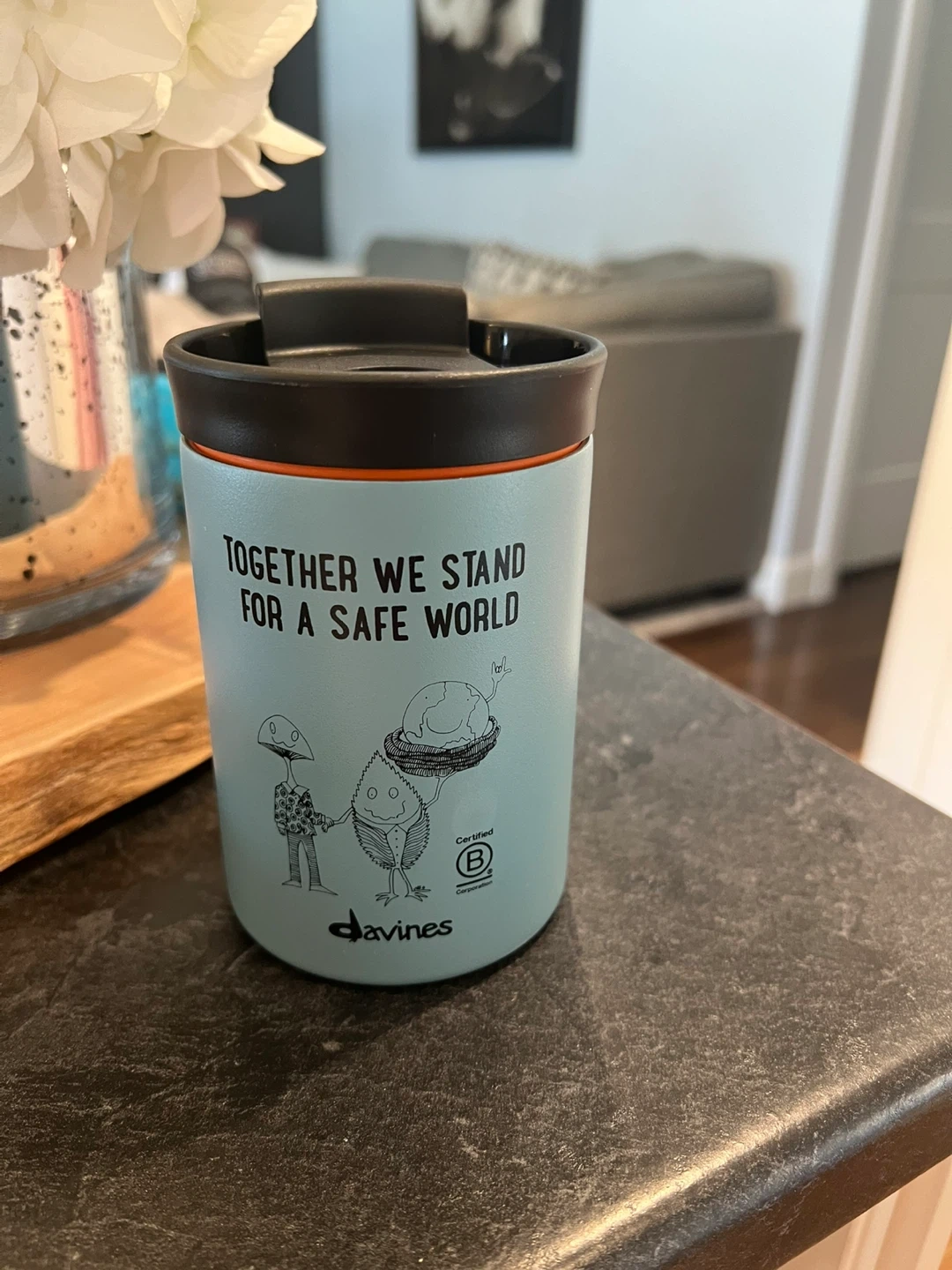 Here's a cute Davines tumbler! It says "Together We Stand For A Safe World" and has a fun design on it. Perfect for keeping your drinks hot or cold on the go