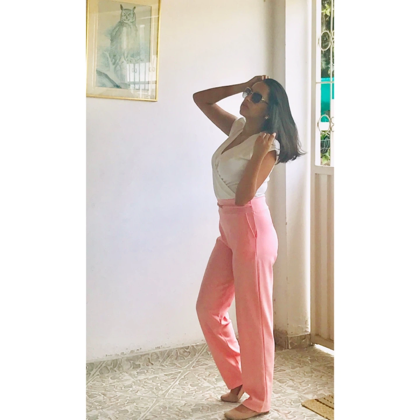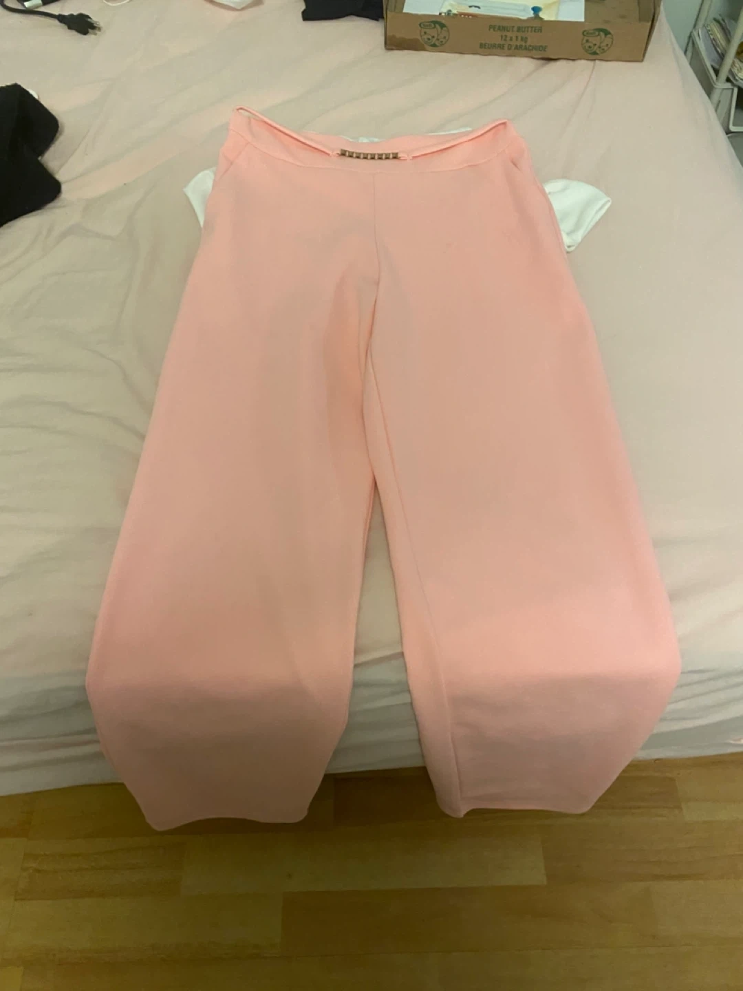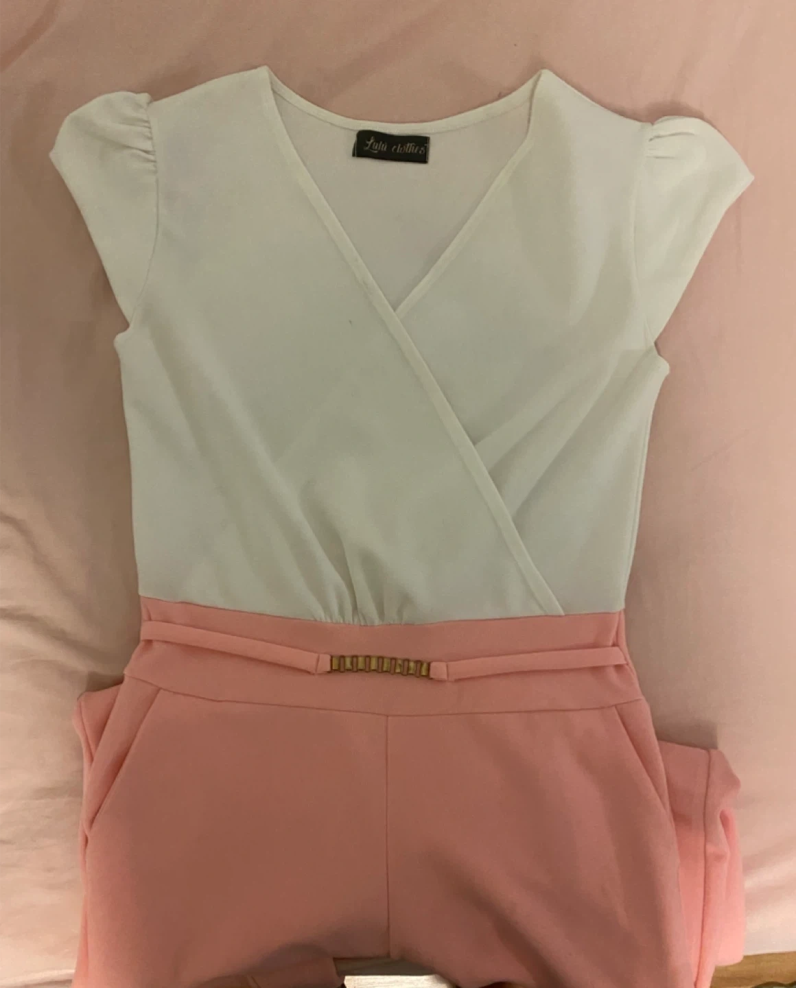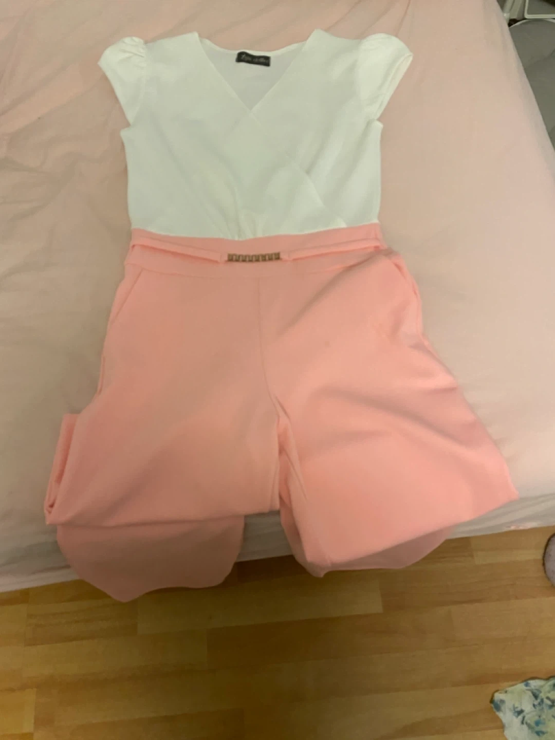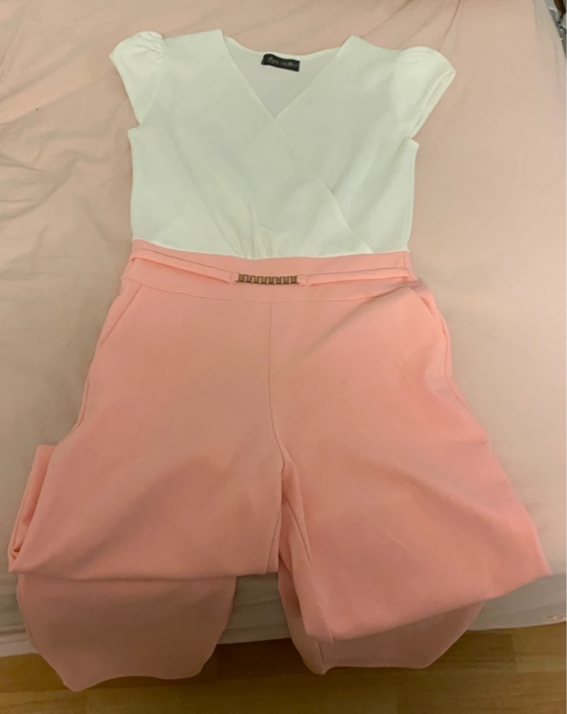 Selling a NEW cute jumpsuit wear it only twice! It features a white top with a V-neck and short sleeves, paired with stylish pink culottes. Perfect for a chic and comfortable look. Amazing for summer fall vibes like these days as it is warmer fabric. Last photo is how it looks.