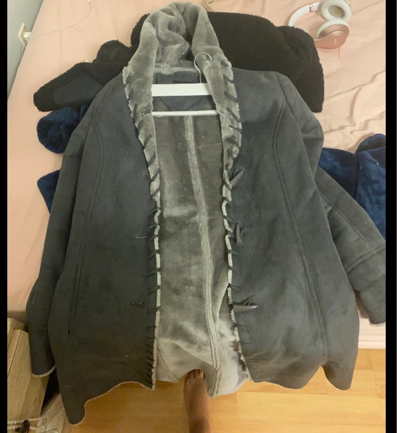 Cozy up with this grey faux suede coat! It features a soft faux fur lining that's perfect for chilly days. The coat has toggle closures and a hood for extra warmth and style. It's in great condition and ready for a new home