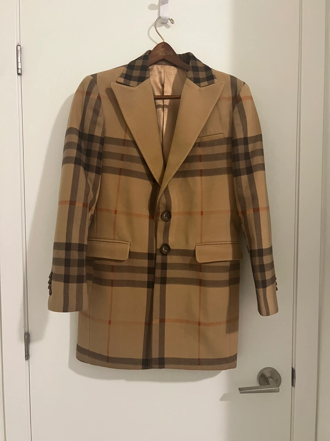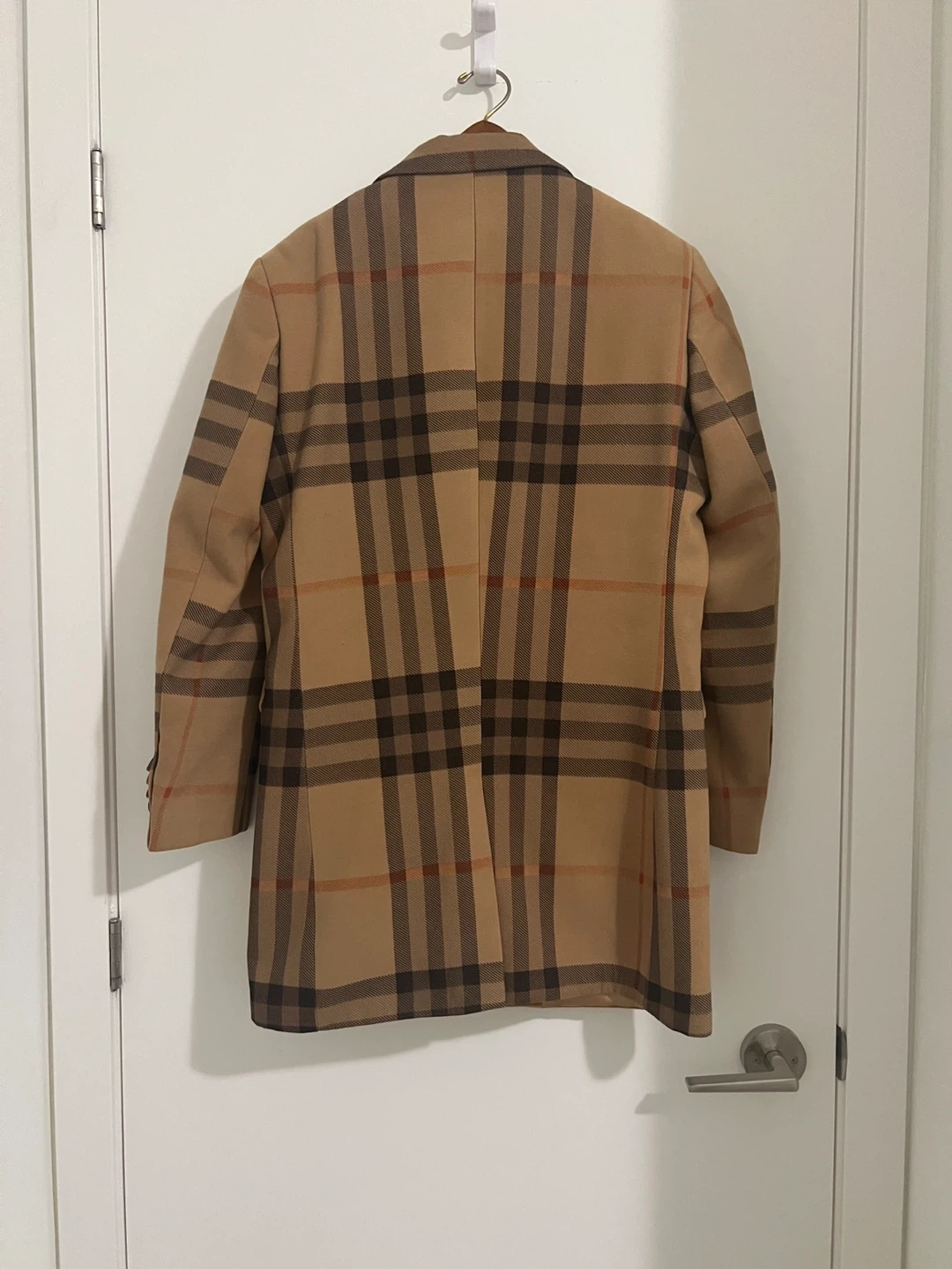 Here's a stylish Burberry coat in a classic plaid pattern! It's made of wool and perfect for adding a touch of elegance to your wardrobe. It's in great condition and ready for a new home