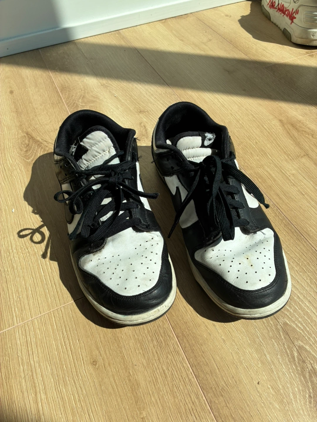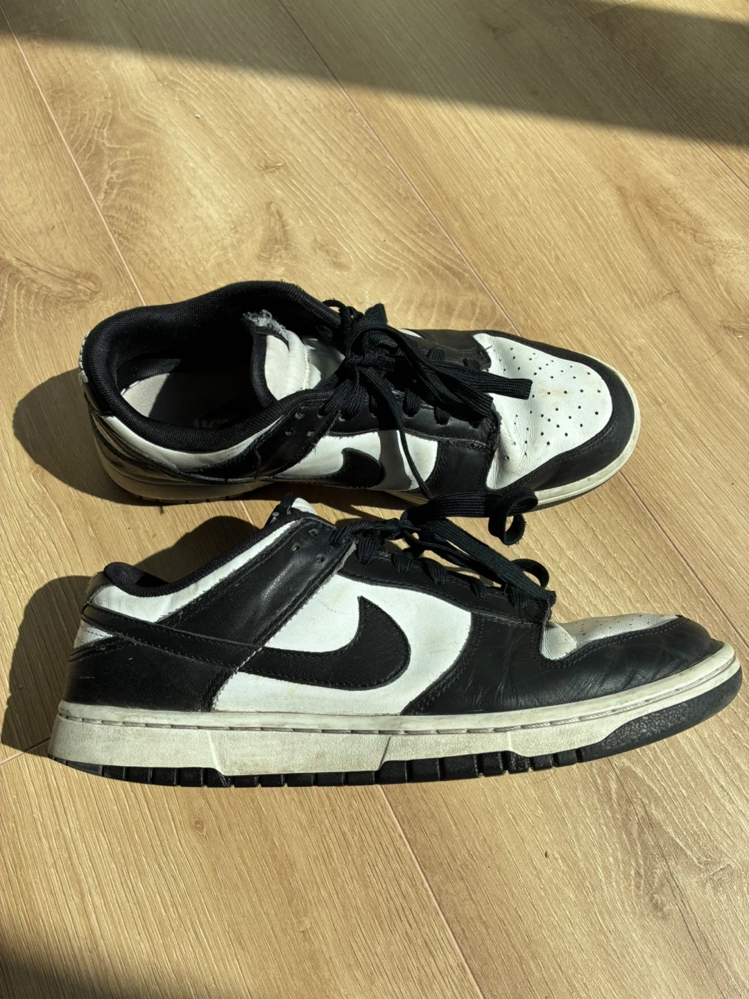 Selling a pair of Nike Dunk Low Panda shoes. They have a classic black and white colorway, perfect for any outfit. These shoes have some signs of wear, but still have plenty of life left! size 9.5