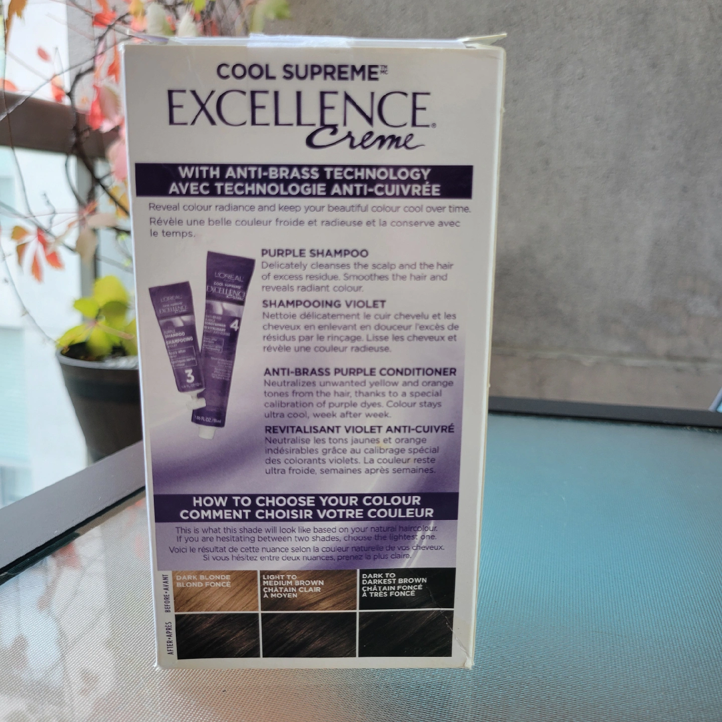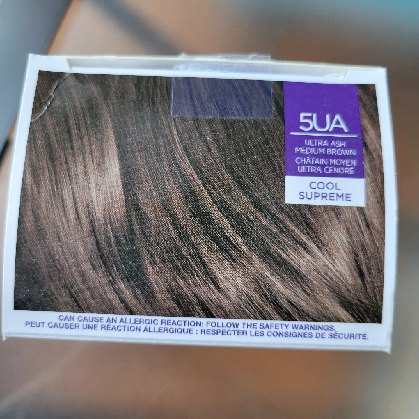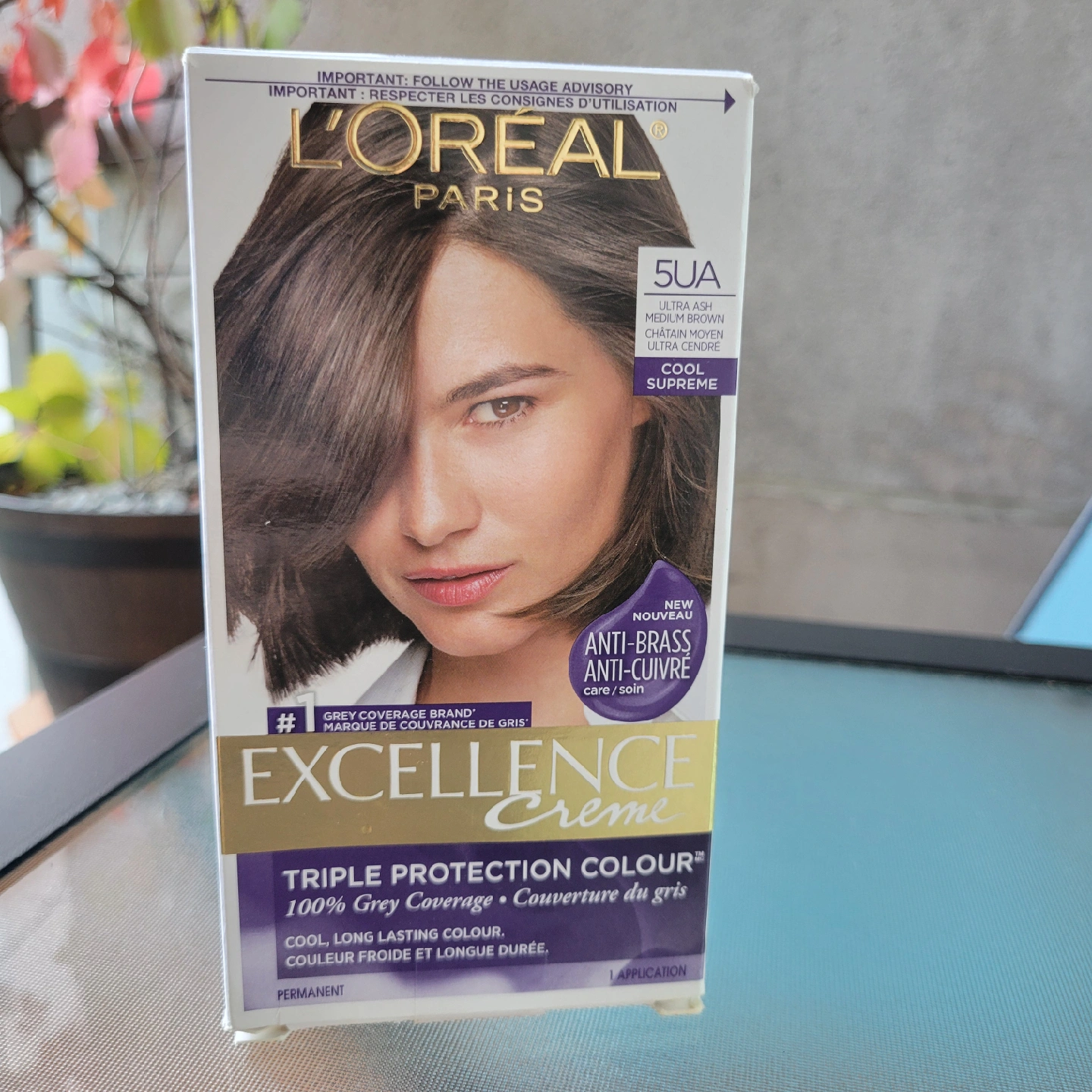 Selling a box of L'Oreal Paris Excellence Creme hair colour in 5UA Ultra Ash Medium Brown. It's a triple protection colour for 100% grey coverage, providing cool, long-lasting colour. The box also includes anti-brass technology and comes with purple shampoo and anti-brass purple conditioner to keep your hair looking radiant and cool!