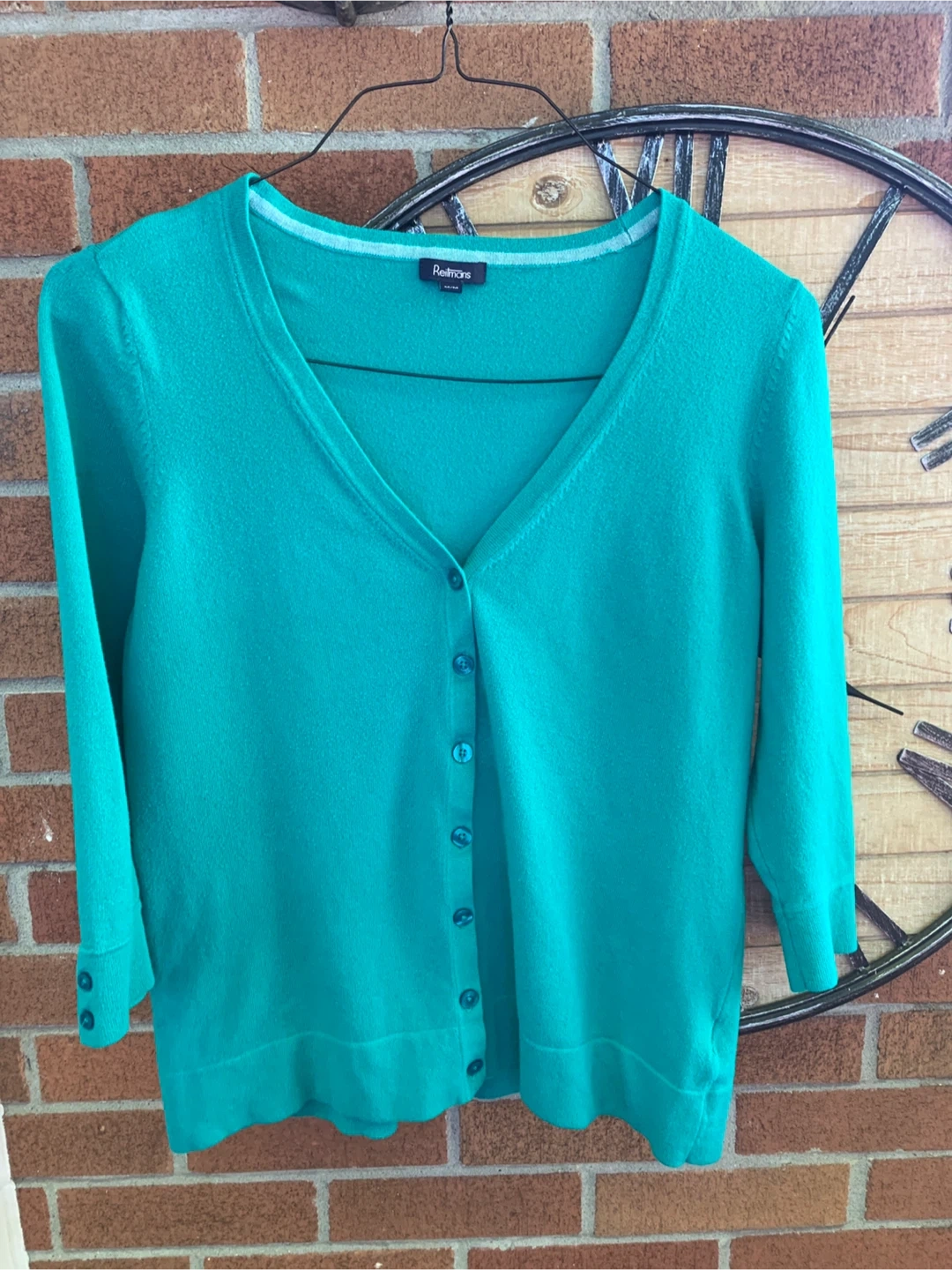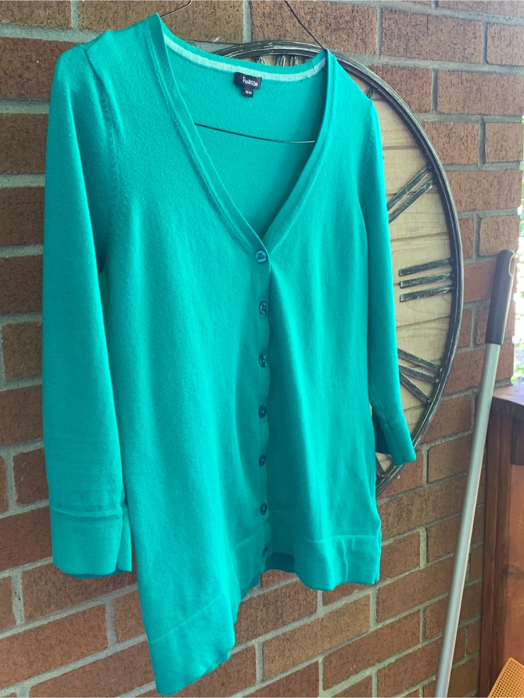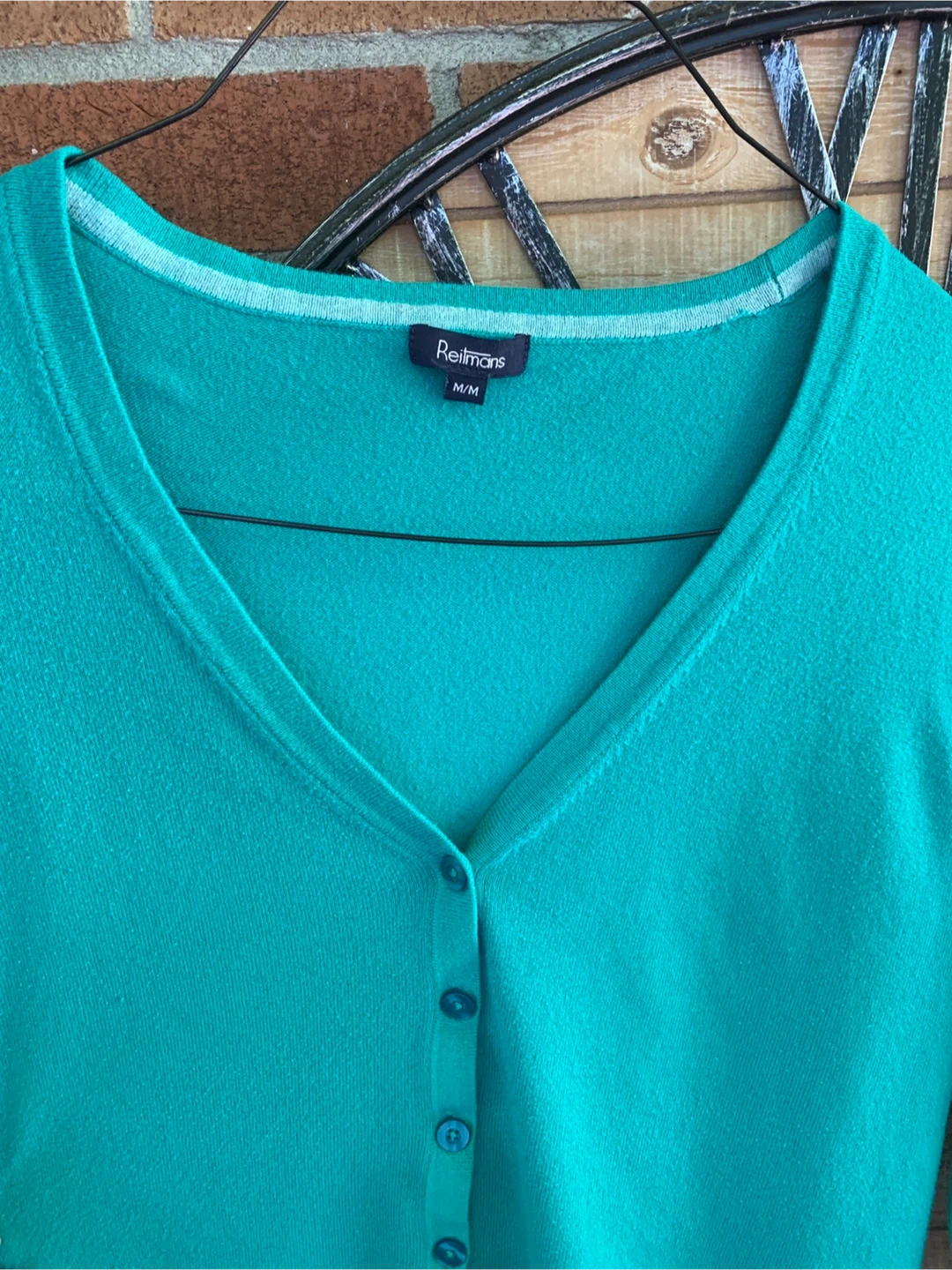 Up for grabs is a lovely teal cardigan from Reitmans! It's a size M and made of 82% cotton and 18% nylon. It has 3/4 sleeves and a button front closure. Perfect for layering into the fall. 🍂