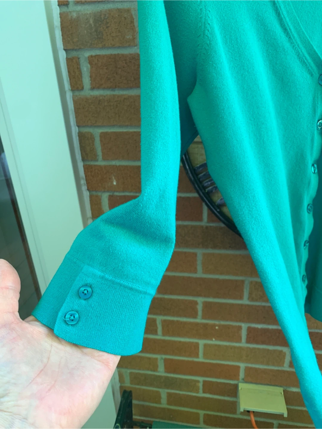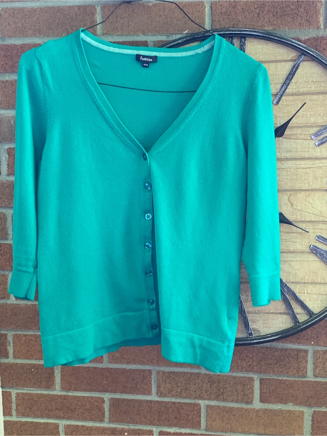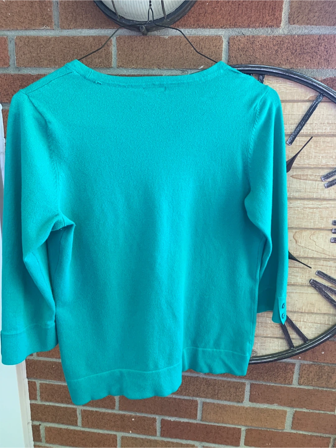 Up for grabs is a lovely teal cardigan from Reitmans! It's a size M and made of 82% cotton and 18% nylon. It has 3/4 sleeves and a button front closure. Perfect for layering into the fall. 🍂