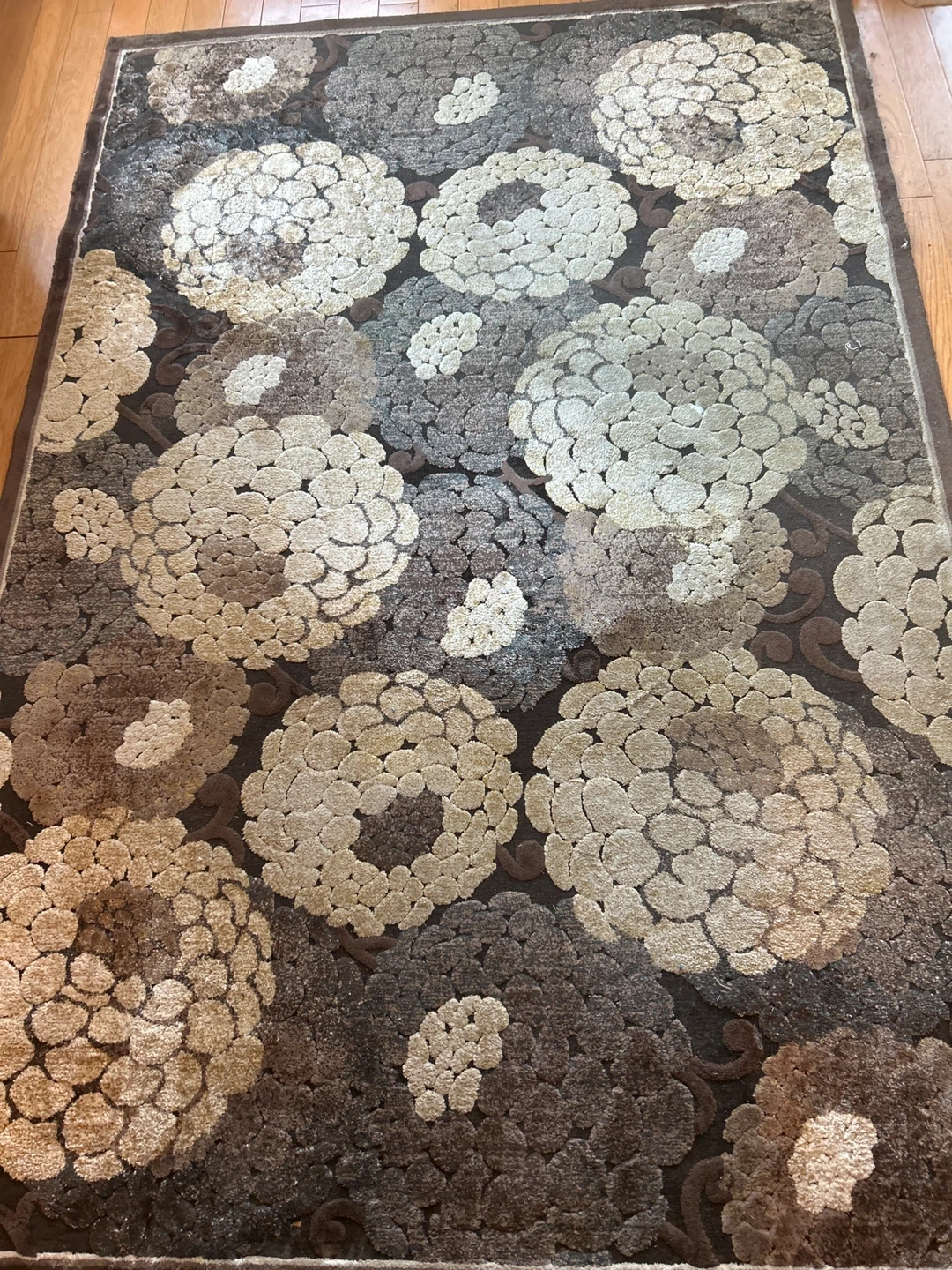 This is a gently used area rug with a lovely floral pattern. The rug features various shades of brown and beige, creating a warm and inviting feel. It would be a great addition to any room in your home!