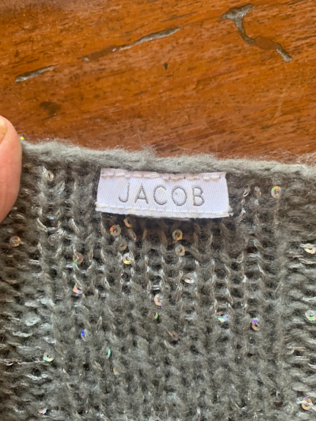 Cozy grey sweater from Jacob! It has some distressed detailing and subtle sequins throughout. Perfect for layering or wearing on its own