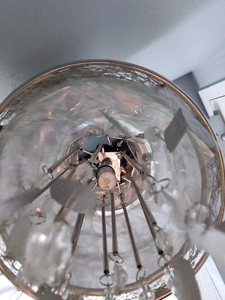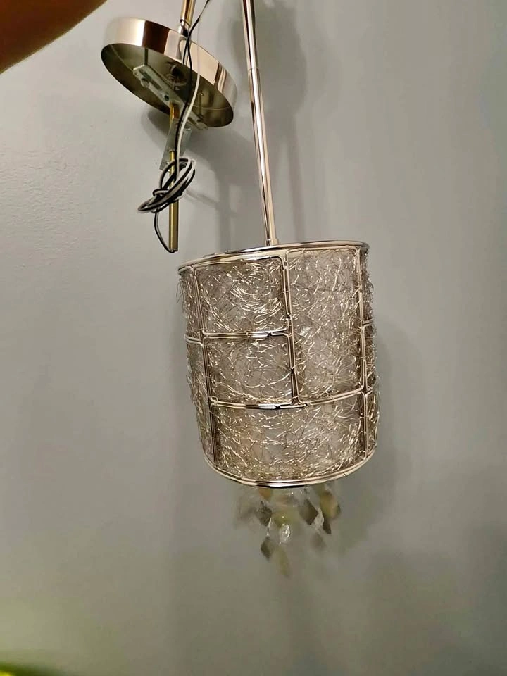 Brand new silver ceiling light fixture looking to brighten up a new home. It is a beautiful piece with some dangling pieces that make a soothing sound when blown on. Take a look at my other related listings!!