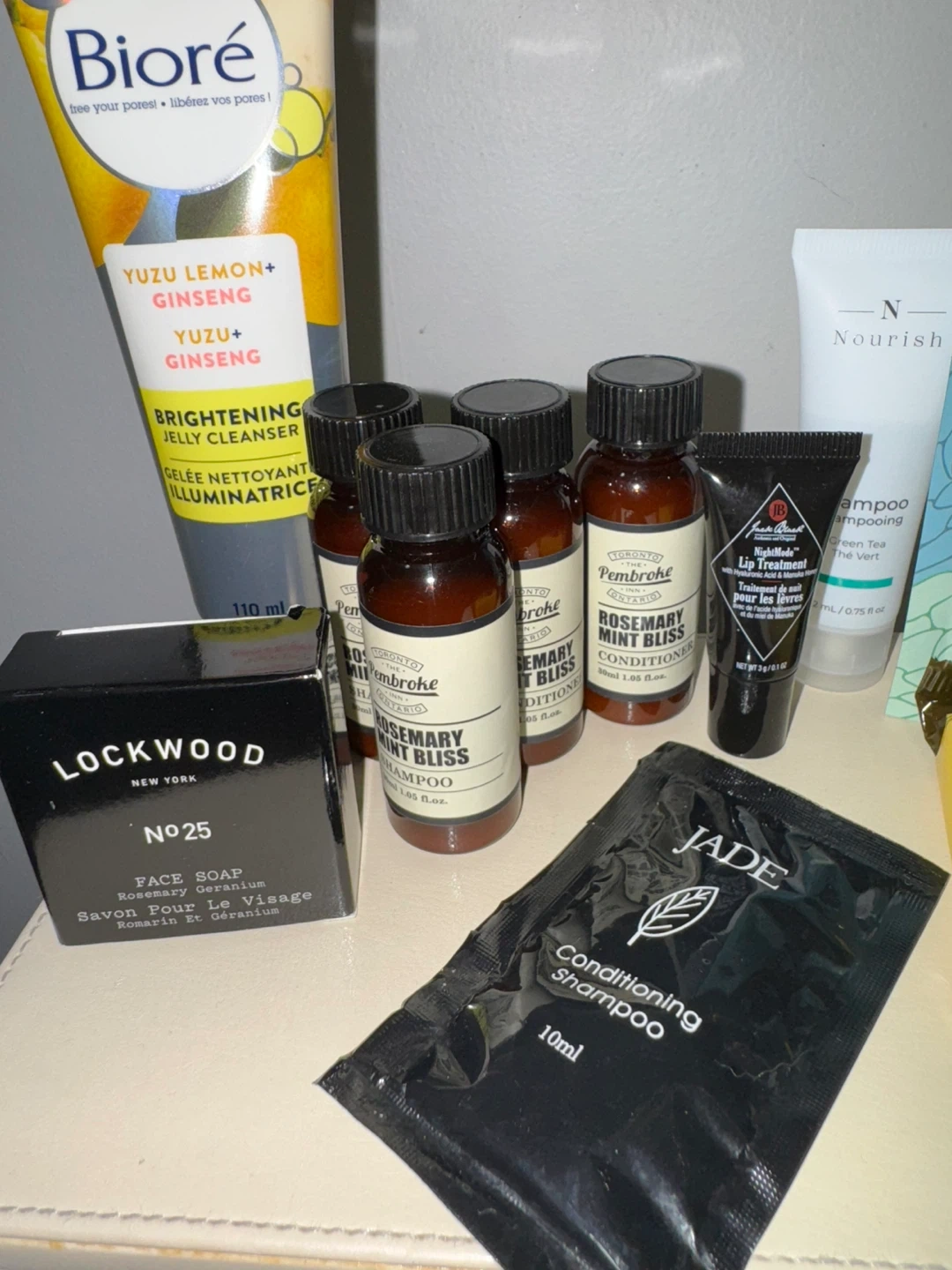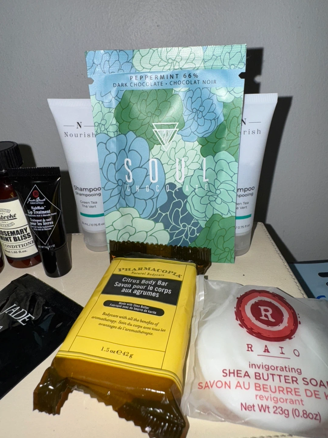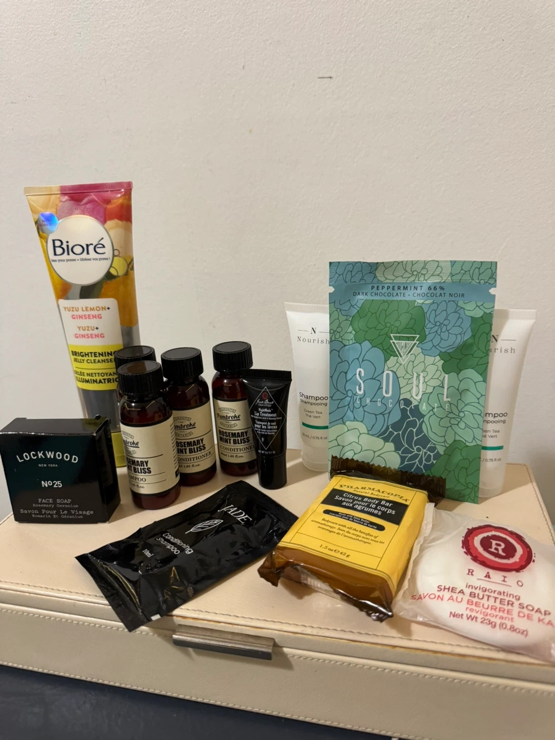 Selling a collection of assorted hotel toiletries. Includes brands like Biore, Lockwood, Pembroke Rosemary Mint Bliss, Nourish, Soul Charcoal, Pharmacopia, and Raio. Perfect for travel or stocking up on essentials! 3x soap bars 4x shampoo 3x conditioner 1x lip treatment 1x full size bioré face wash Chocolate included. All for $10 need this gone!