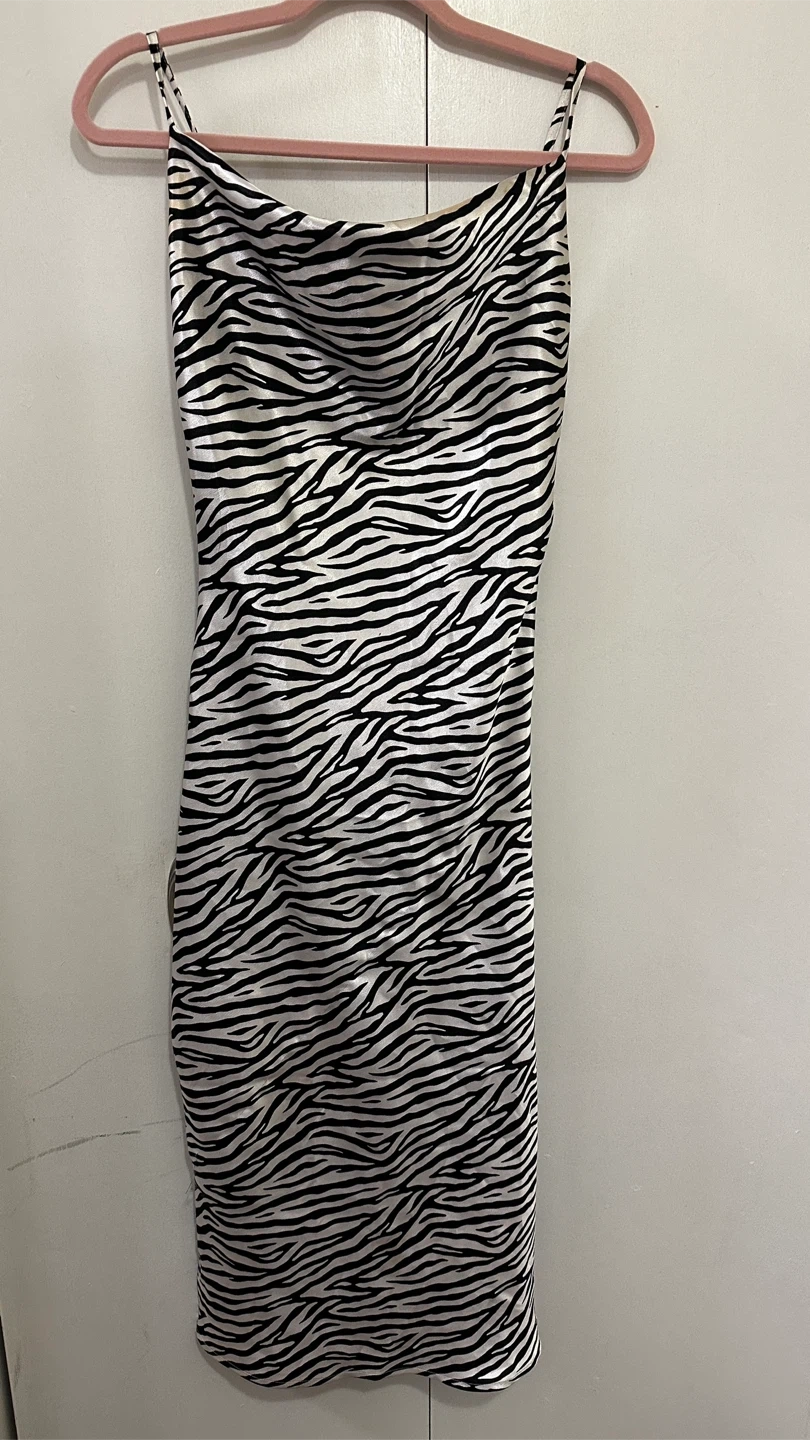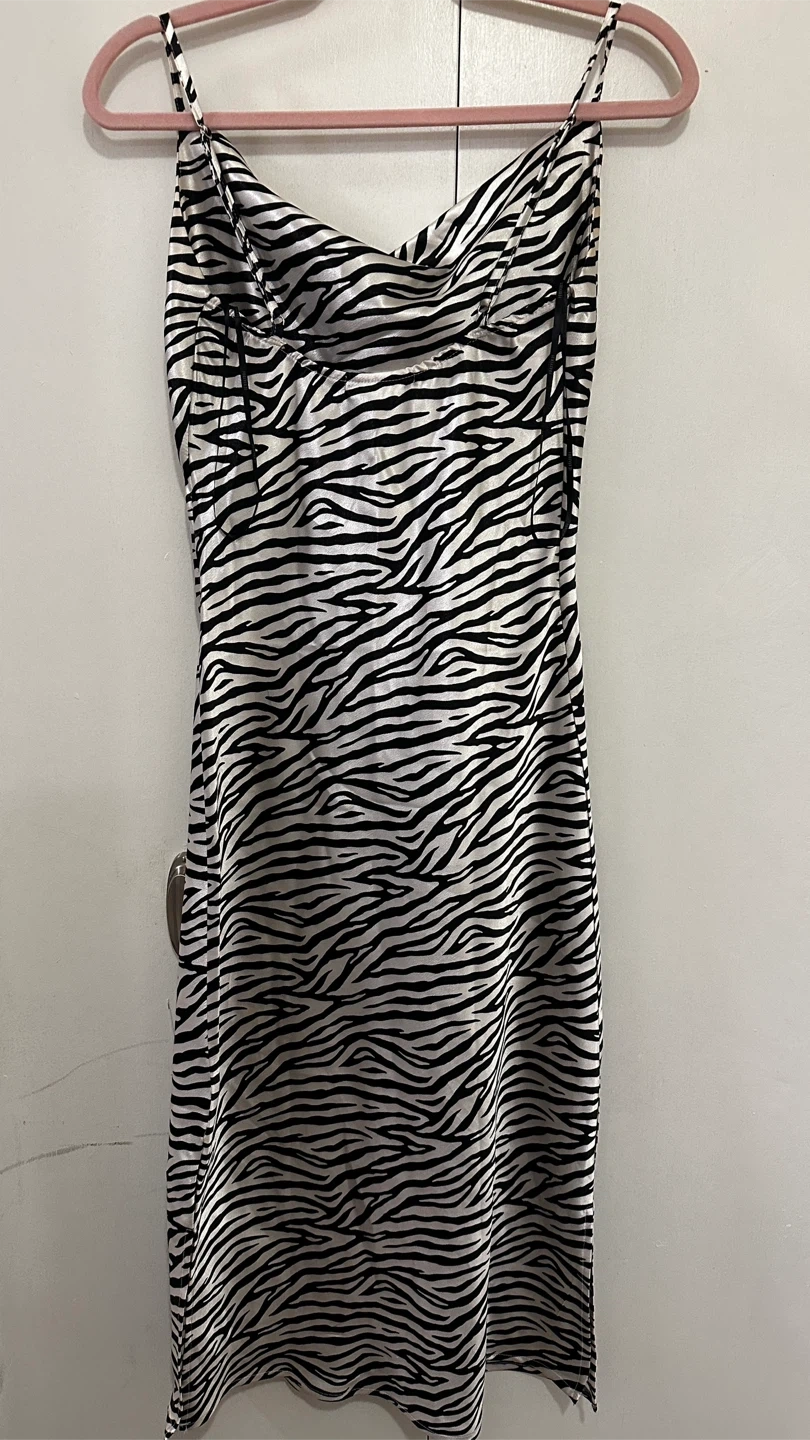 This is a cute cowl neck dress with a zebra print! It's perfect for a night out or a special occasion. The dress is in great condition.