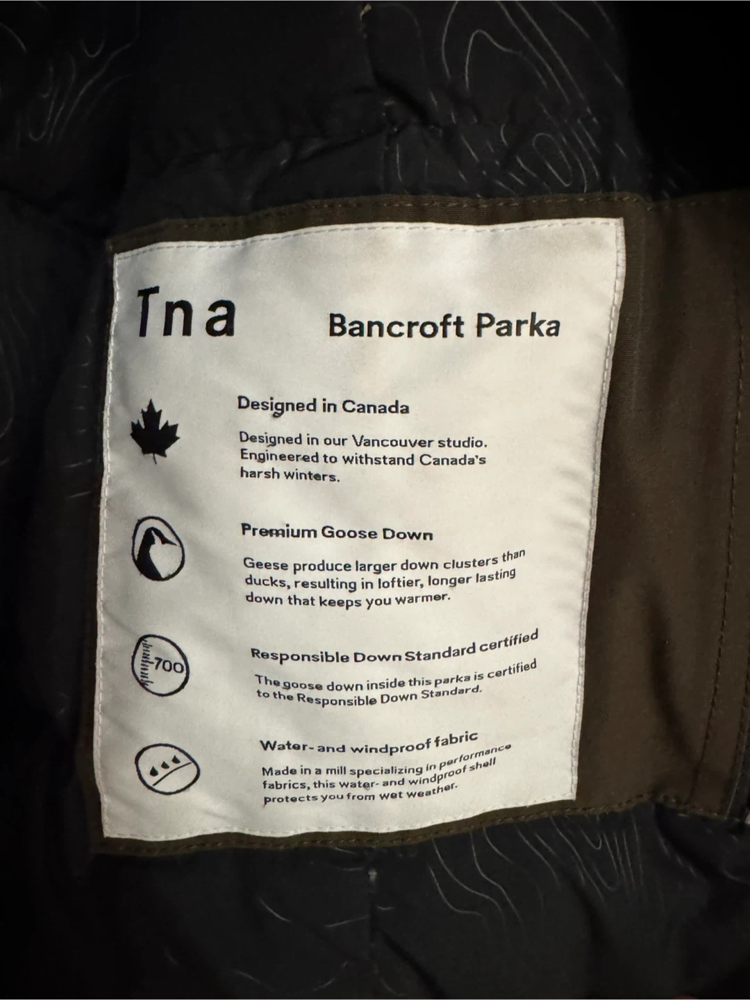 Selling TNA Bancroft Parka in size women’s XL but it’s fits for women’s large size. It's a lovely olive green colour and in great condition! Perfect for the Canadian winter. Like new , I bought it for $378 plus tax Asking for $150 Yonge and finch area