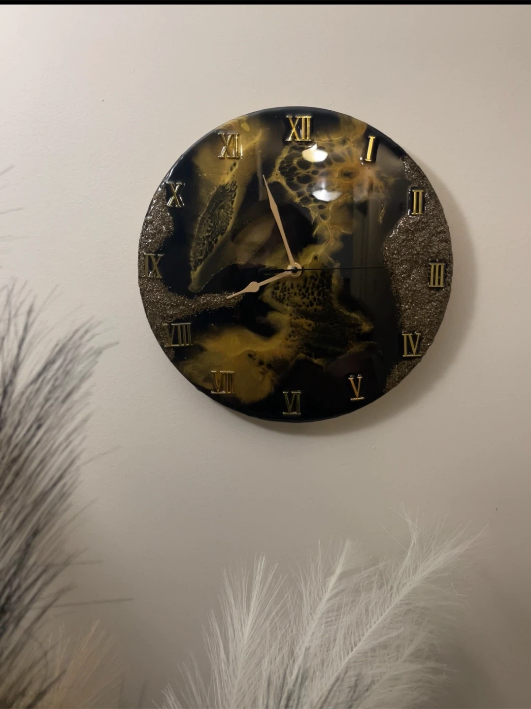 Add a touch of modern luxury to your home with this handmade resin wall clock. • Diameter: 30 cm (12 inches) • Colors: Black, gold, and shimmering stone texture • Roman numeral design with golden accents • Unique piece — each clock is one of a kind Perfect for living rooms, offices, or as a thoughtful gift.