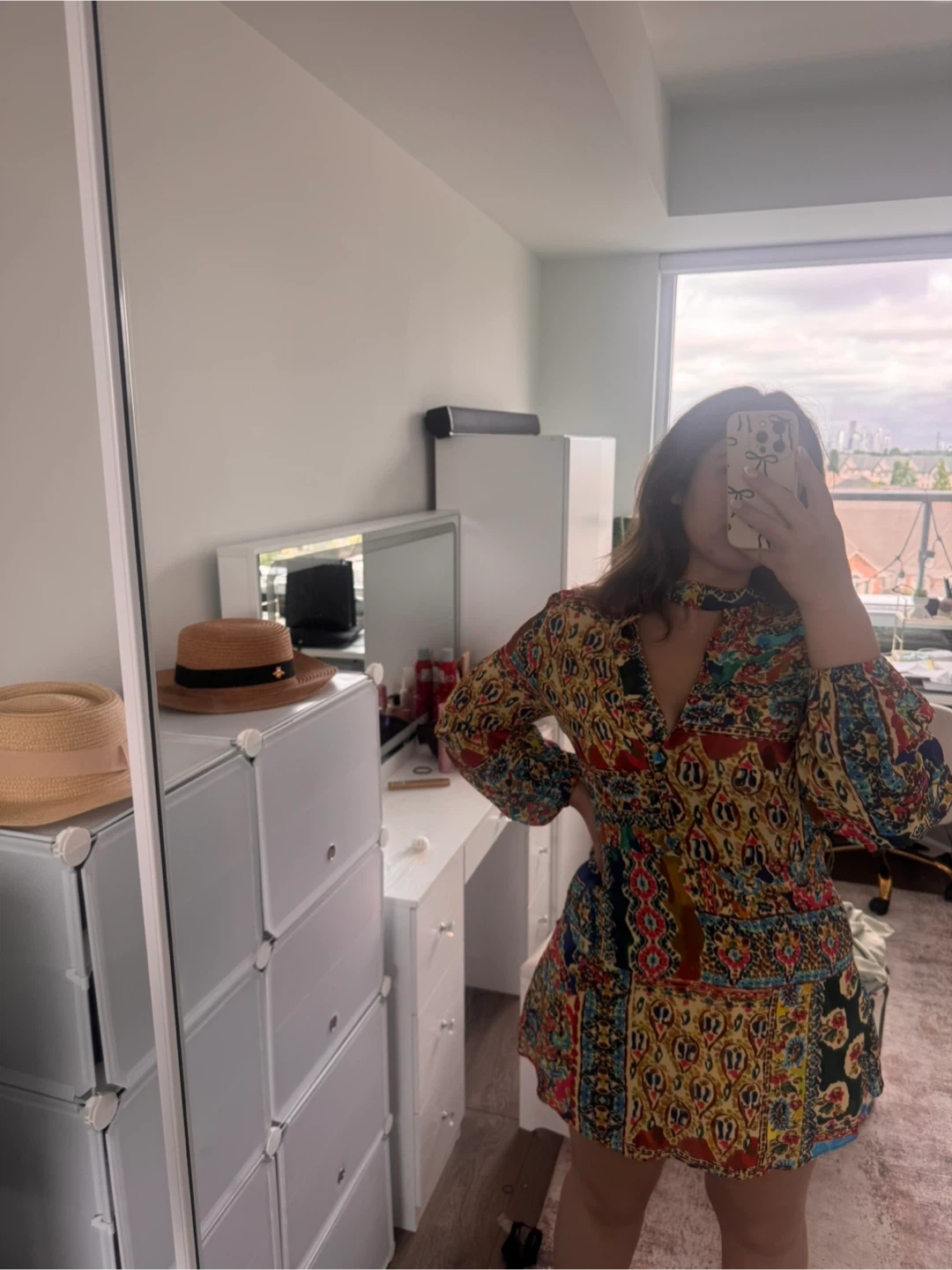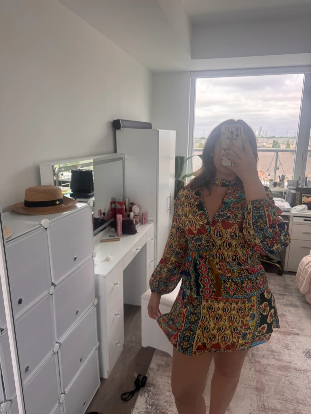 Selling a colourful patterned mini dress. It has a unique design and would be great for a summer day out. It's in great condition and ready for a new home!