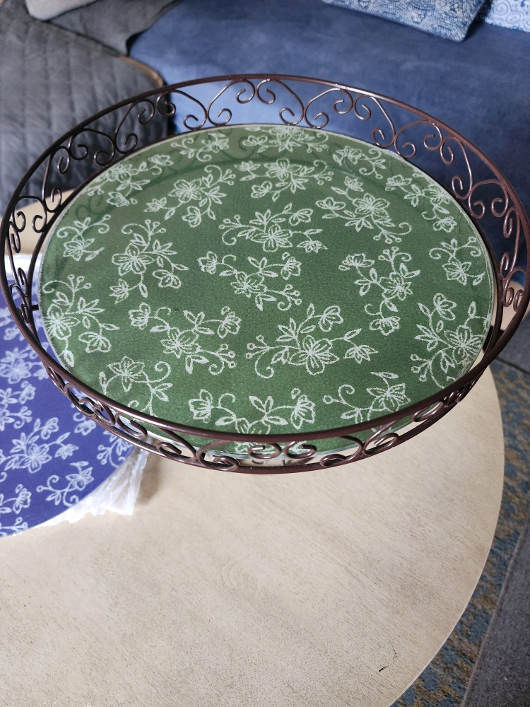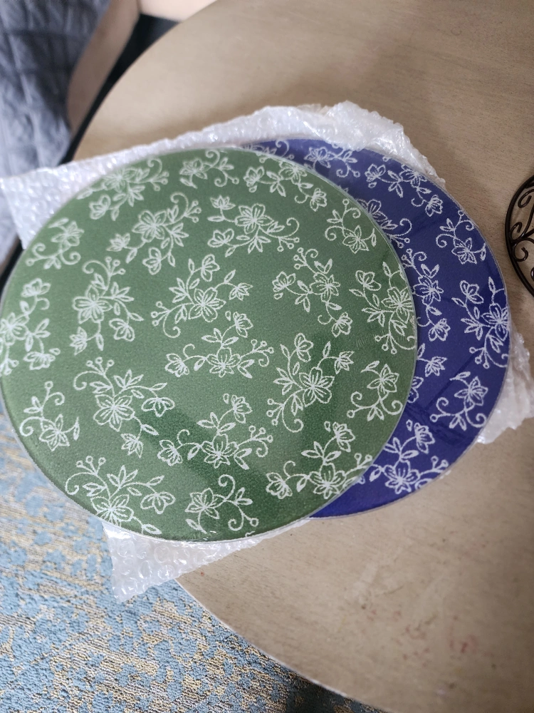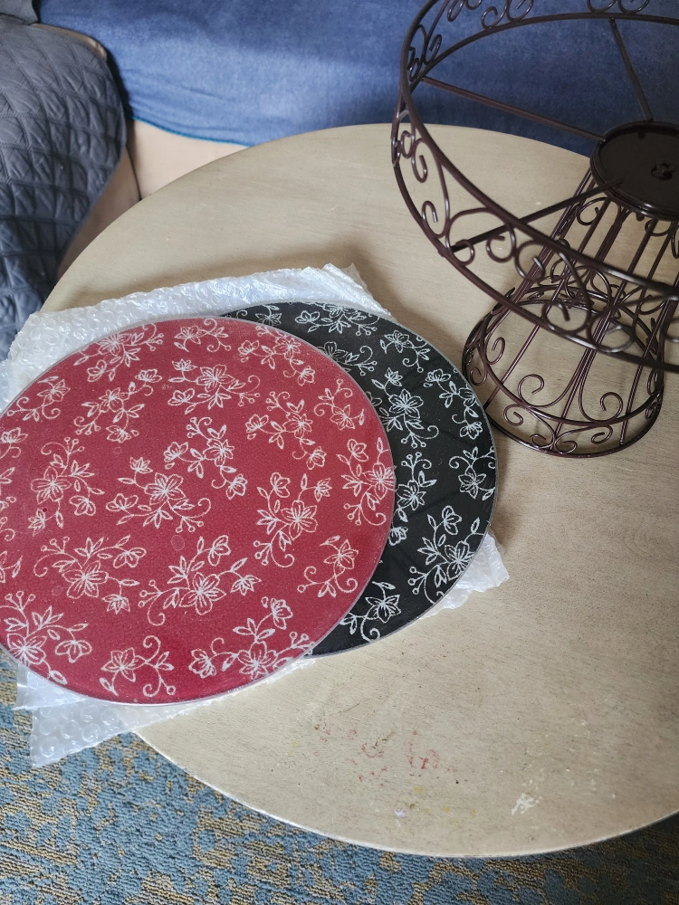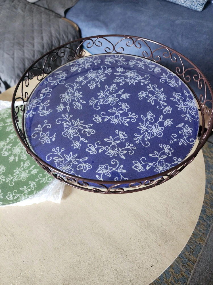 Black Metal Wire Cake or Cupcake Pedestal Stand with 4 Interchangeable Seasonal Plates (Red), (Green), (Blue) & (Black) This cake stand is in excellent condition brand new and never used. Four different plates representing the four seasons. 4 glass plates all shrink wrapped & bubble wrapped, this is a heavy item.