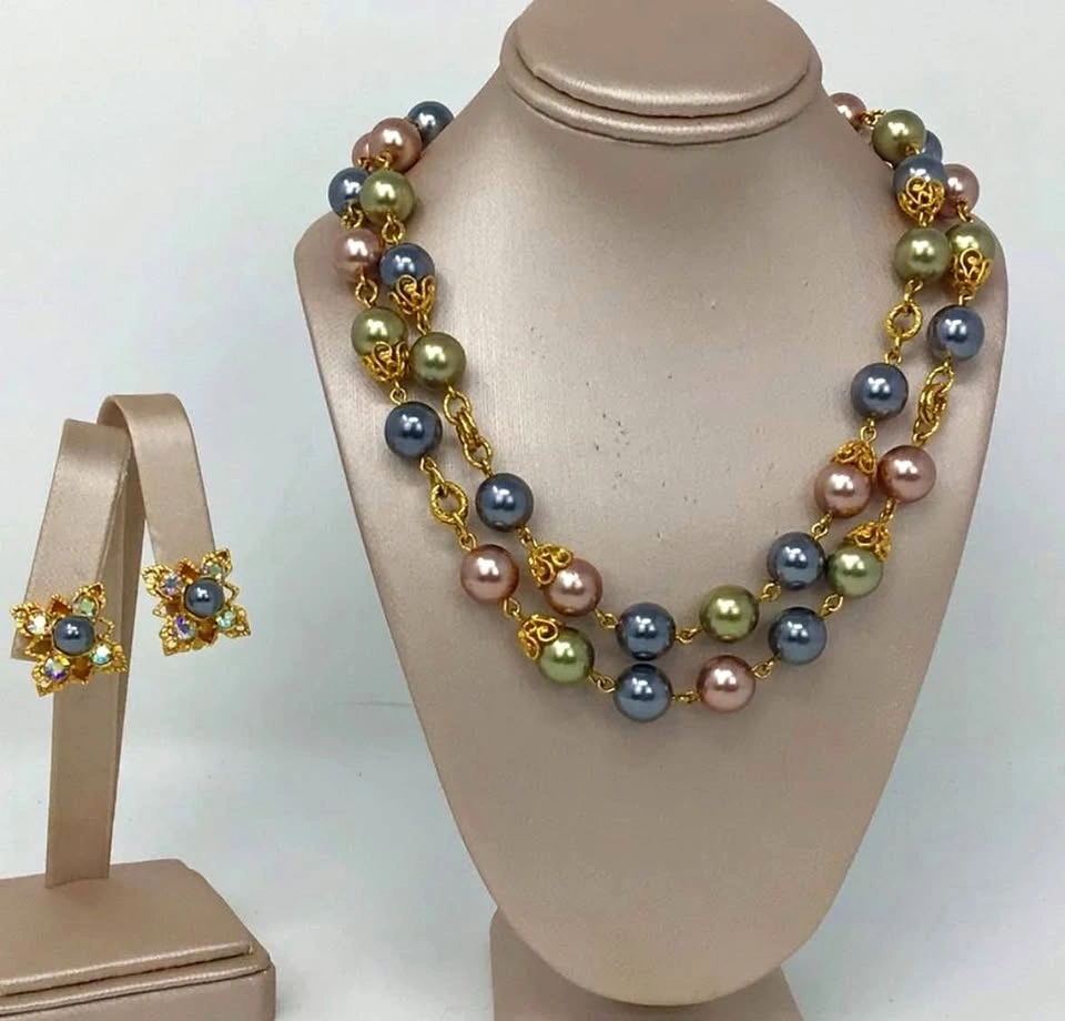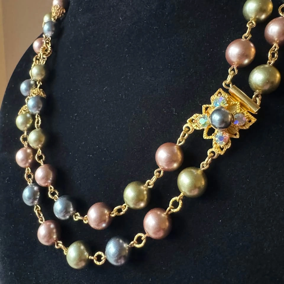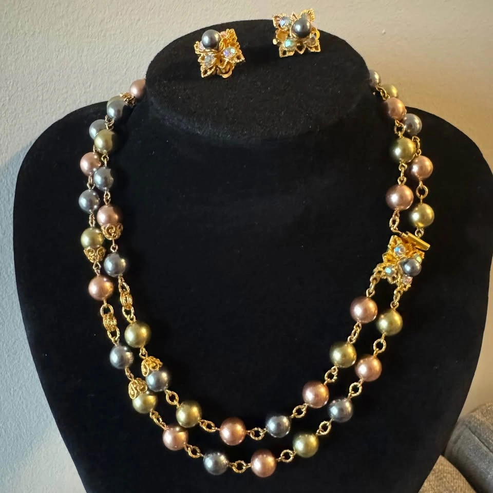 Set of 2 💛 (Necklace + Earrings) Signed Vintage Joan Rivers Double Pearl Strand + Matching Clip On Earrings (AB) A wonderful signed Joan Rivers vintage costume jewelry double strand coloured faux pearls (beautiful pastel shades of pink, grey, blue, gray, olive green) and prong set aurora borealis rhinestones. Set of necklace with matching clip on earrings. The necklace and earrings are in gold tone metal and are each signed “Joan Rivers”. Beautiful collectible! The longest strand of the necklace is 18 inches long and the earrings are approximately 5/8 of an inch square. All pieces are in lovely condition. This set will be shipped from a smoke and pet free home.