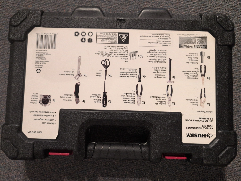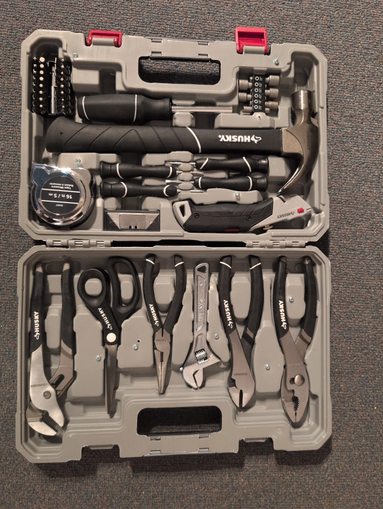 Selling a Husky 62-piece homeowner tool set in excellent condition! This set includes a variety of essential tools for household repairs and projects, all neatly organized in a durable carrying case. Perfect for DIY enthusiasts or anyone looking to build their tool collection! The set includes a hammer, pliers, screwdrivers, tape measure, and more!